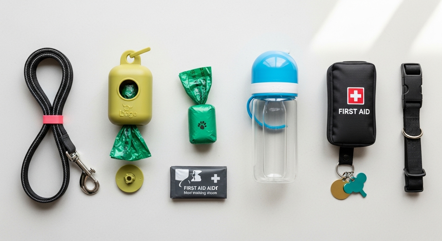 ✔️ 산책 도구 활용: 목줄, 인식표, 배변 봉투, 필요 시 신발, 옷, 기피제.