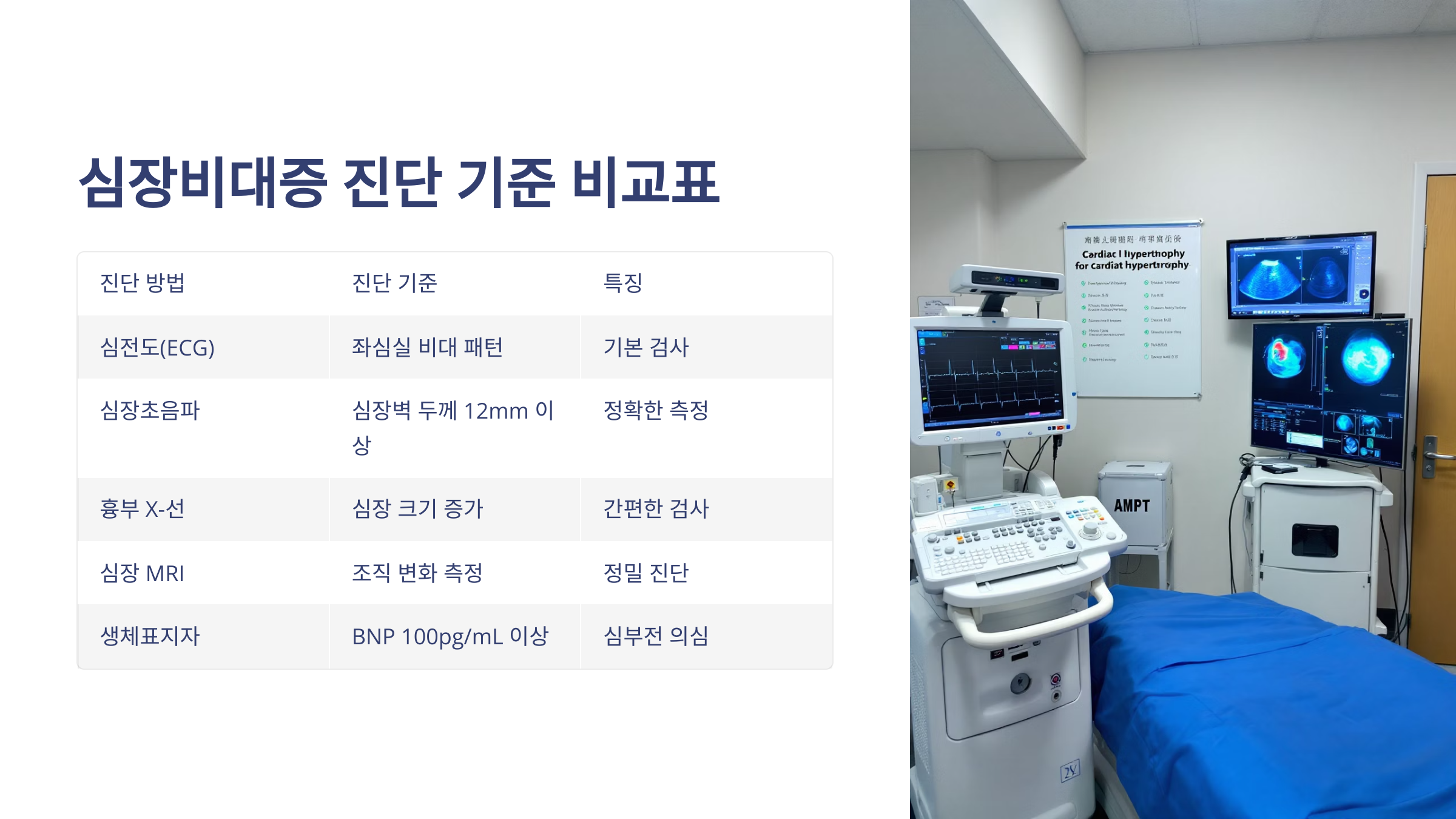 심장비대증의 진단은 보통 심장초음파(Echocardiography)로 이뤄지며, 각국 가이드라인에 따라 기준이 조금씩 달라요. 아래 표는 대표적인 진단 기준을 정리한 거예요.