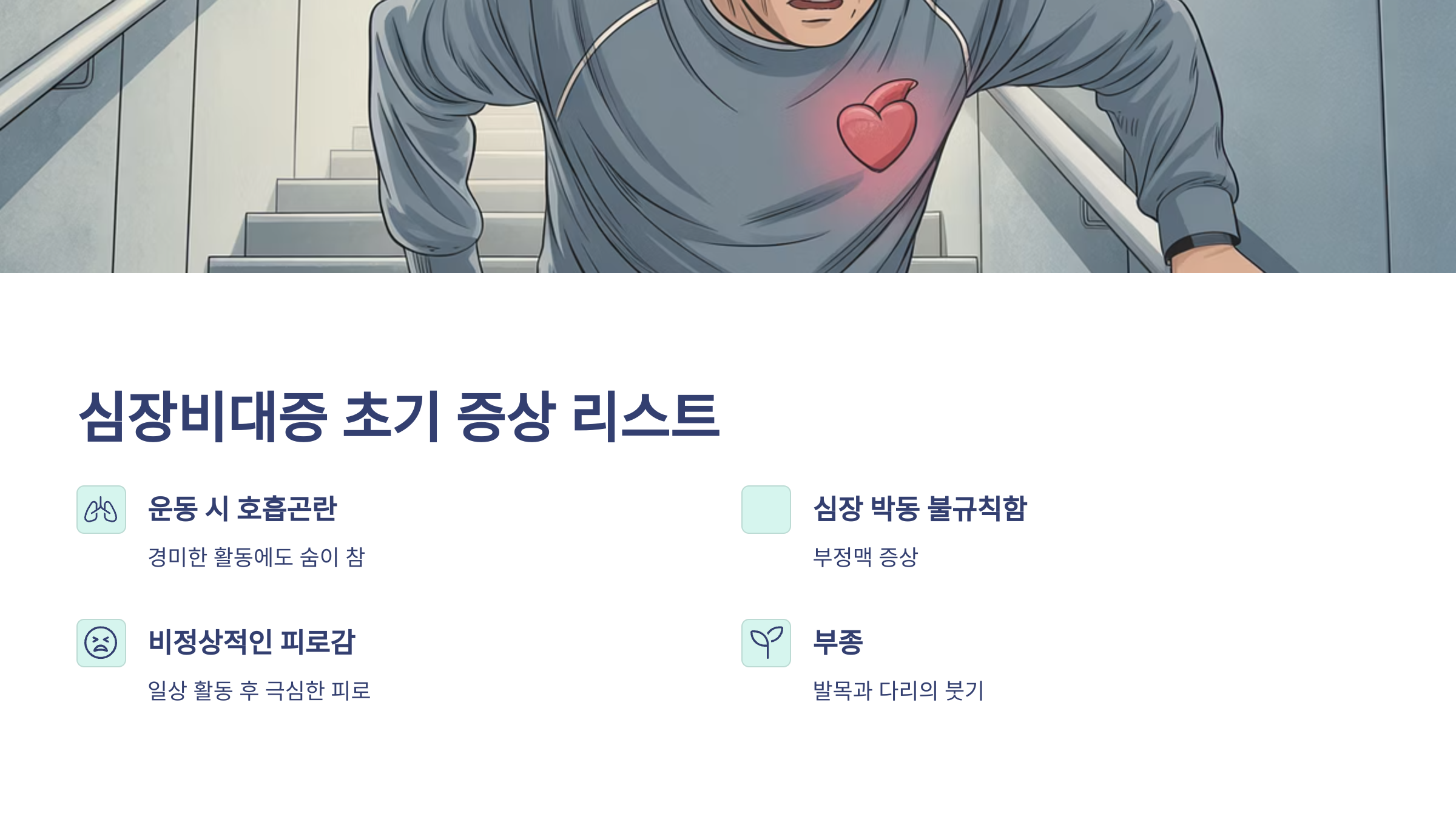 심장비대증은 초기에 특별한 증상이 없을 수 있어요. 그래서 무시되기 쉬운데요, 아래와 같은 증상들이 반복된다면 꼭 병원을 찾아야 해요.