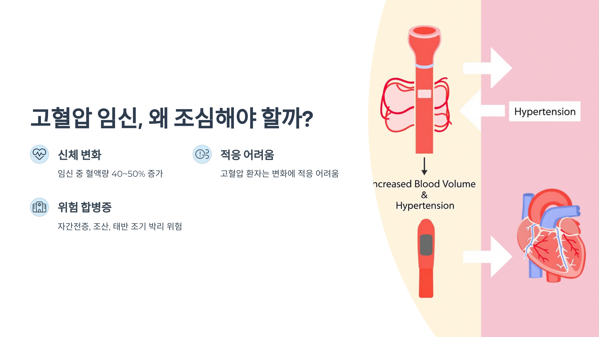 임신은 신체적으로 굉장히 복잡한 과정이에요. 호르몬이 급격히 변화하고, 혈액량이 40~50% 가까이 늘어나면서 심장과 혈관에 더 큰 부담이 가게 되죠. 그런데 이미 고혈압을 가지고 있는 여성은 이 변화에 몸이 쉽게 적응하지 못할 수 있어요. 이로 인해 자간전증, 조산, 태반 조기 박리 같은 위험한 합병증이 발생할 수 있답니다. 특히 자간전증은 산모와 태아의 생명을 동시에 위협할 수 있어서 절대 가볍게 보면 안 돼요.