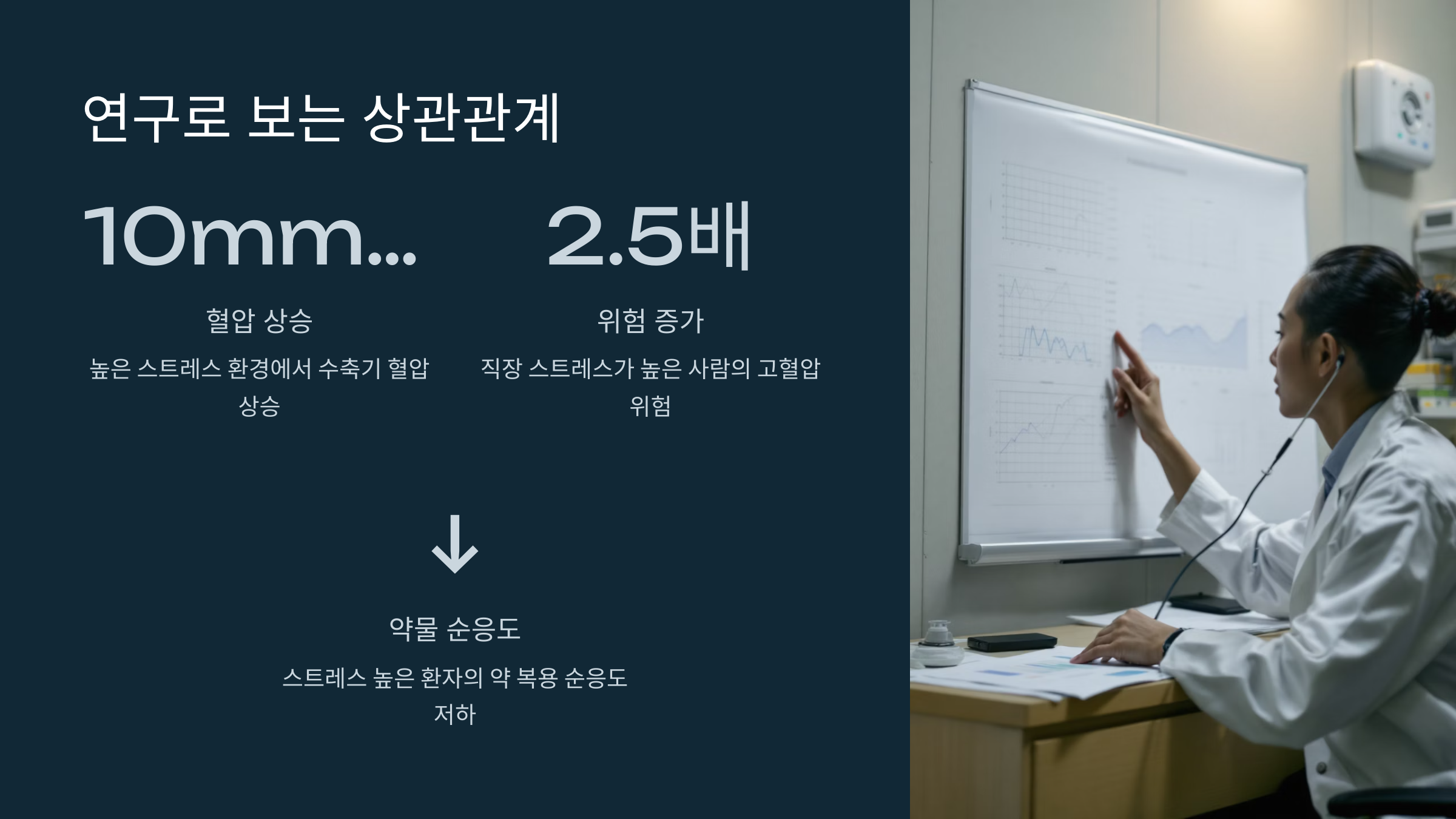다양한 의학 연구 결과들은 스트레스가 고혈압 발병률과 증상의 악화에 밀접한 연관이 있음을 시사합니다. 아래 주요 연구 사례들을 참고해 보세요.