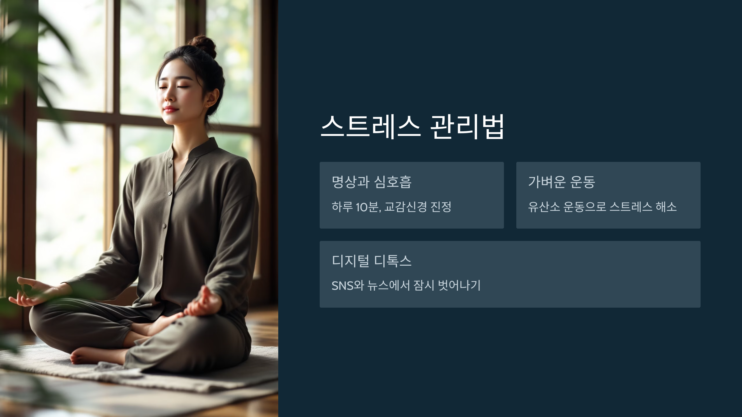 - 하루 10분 명상 또는 심호흡 - 교감신경을 진정시키는 데 탁월