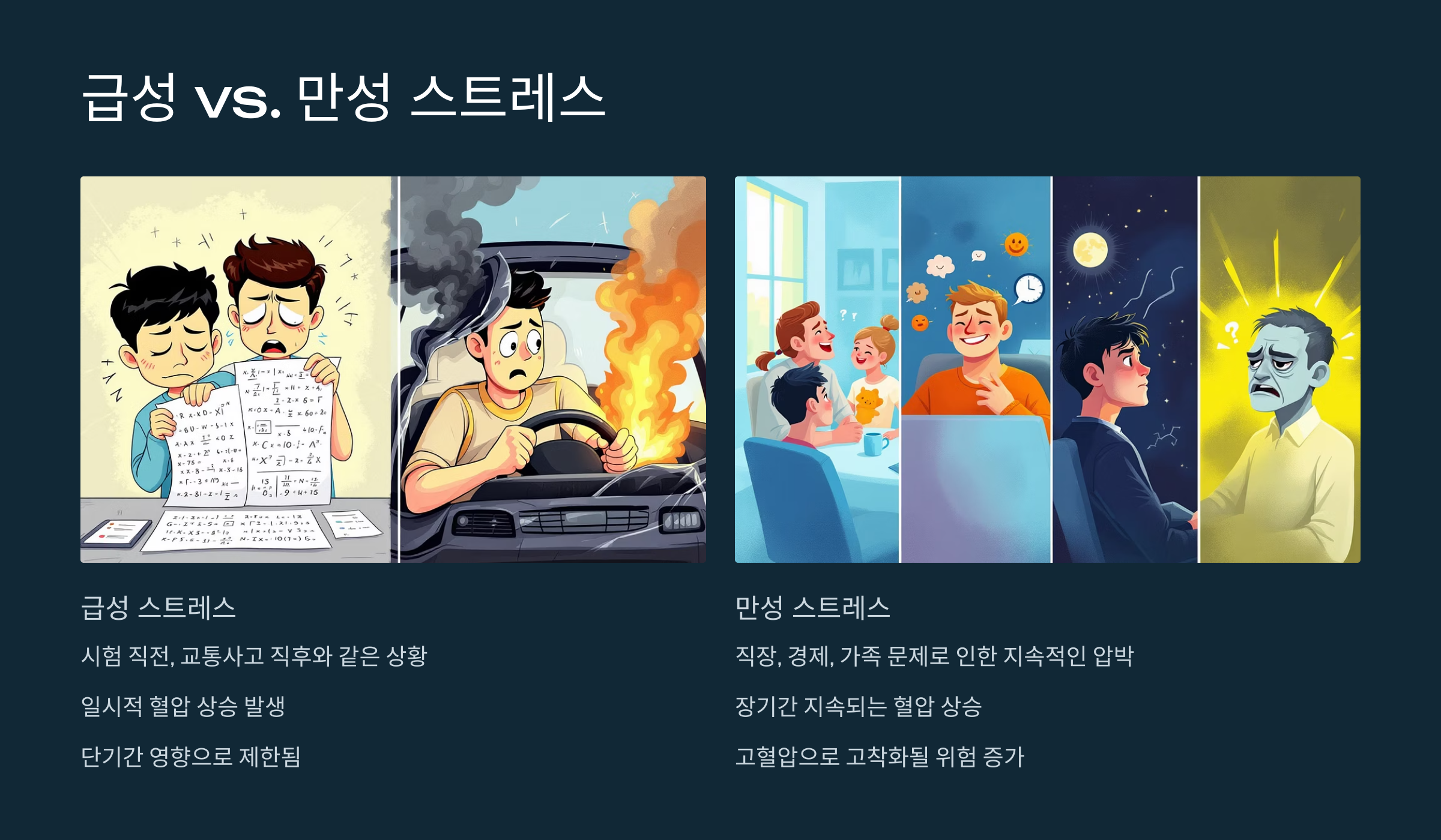 스트레스는 발생 시간과 지속 기간에 따라 혈압에 주는 영향이 달라져요. 갑작스러운 충격처럼 짧은 자극은 일시적 상승에 불과하지만, 장기간 지속되는 만성 스트레스는 고혈압의 주요 유발 요인 중 하나로 작용할 수 있습니다.