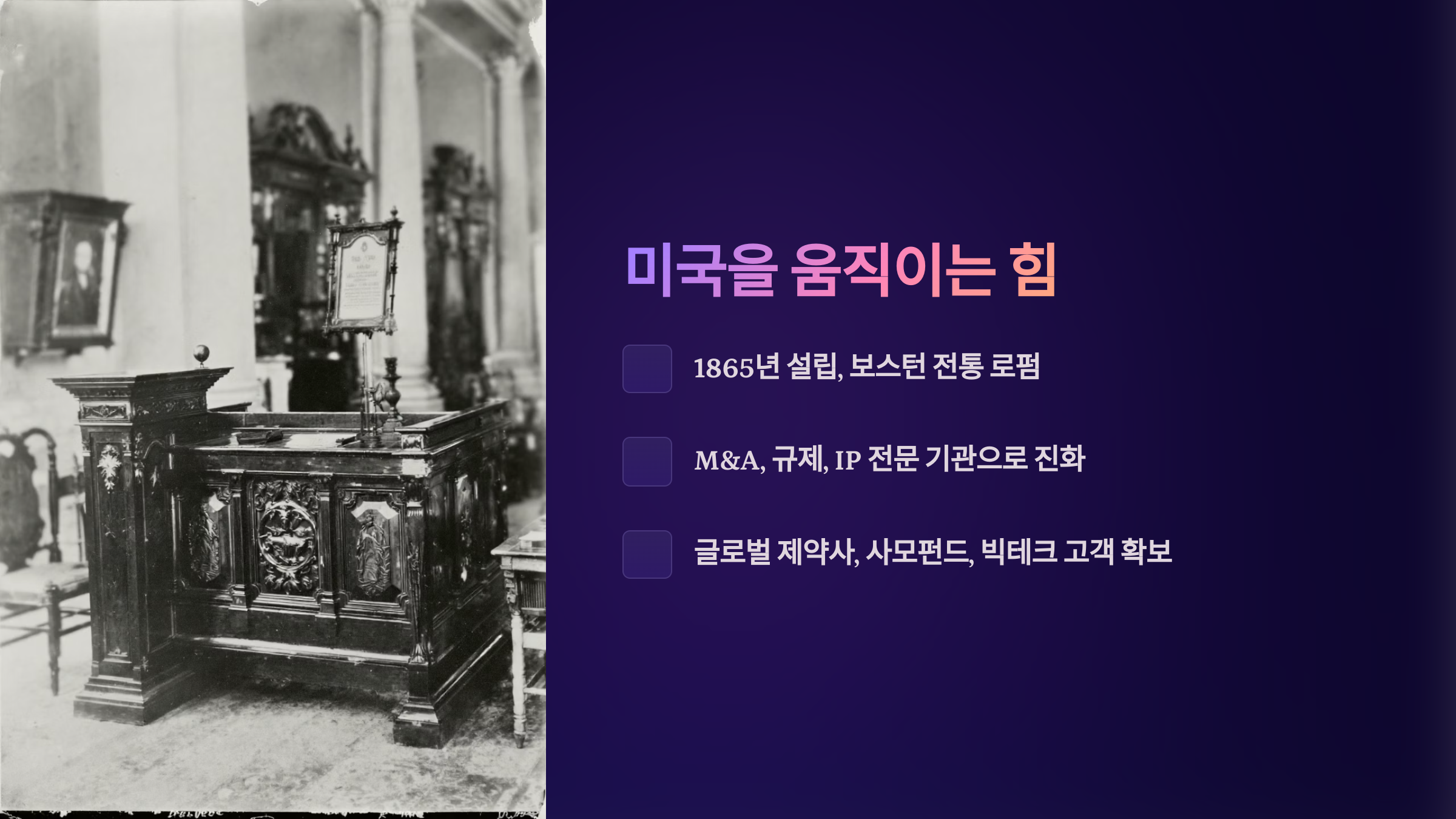 이 로펌의 시작은 1865년, 남북전쟁이 끝나던 해로 거슬러 올라갑니다. 그 긴 역사 속에서 수많은 변화가 있었지만, 한 가지는 변하지 않았습니다. ‘권력의 언어’를 다루는 이들만이 살아남는다는 법칙. 롭스앤그레이는 전통적인 보스턴 로펌에서 글로벌 굴지의 M&A 자문, 규제 대응, IP 보호 전문기관으로 변모하며 스스로를 증명해왔어요.