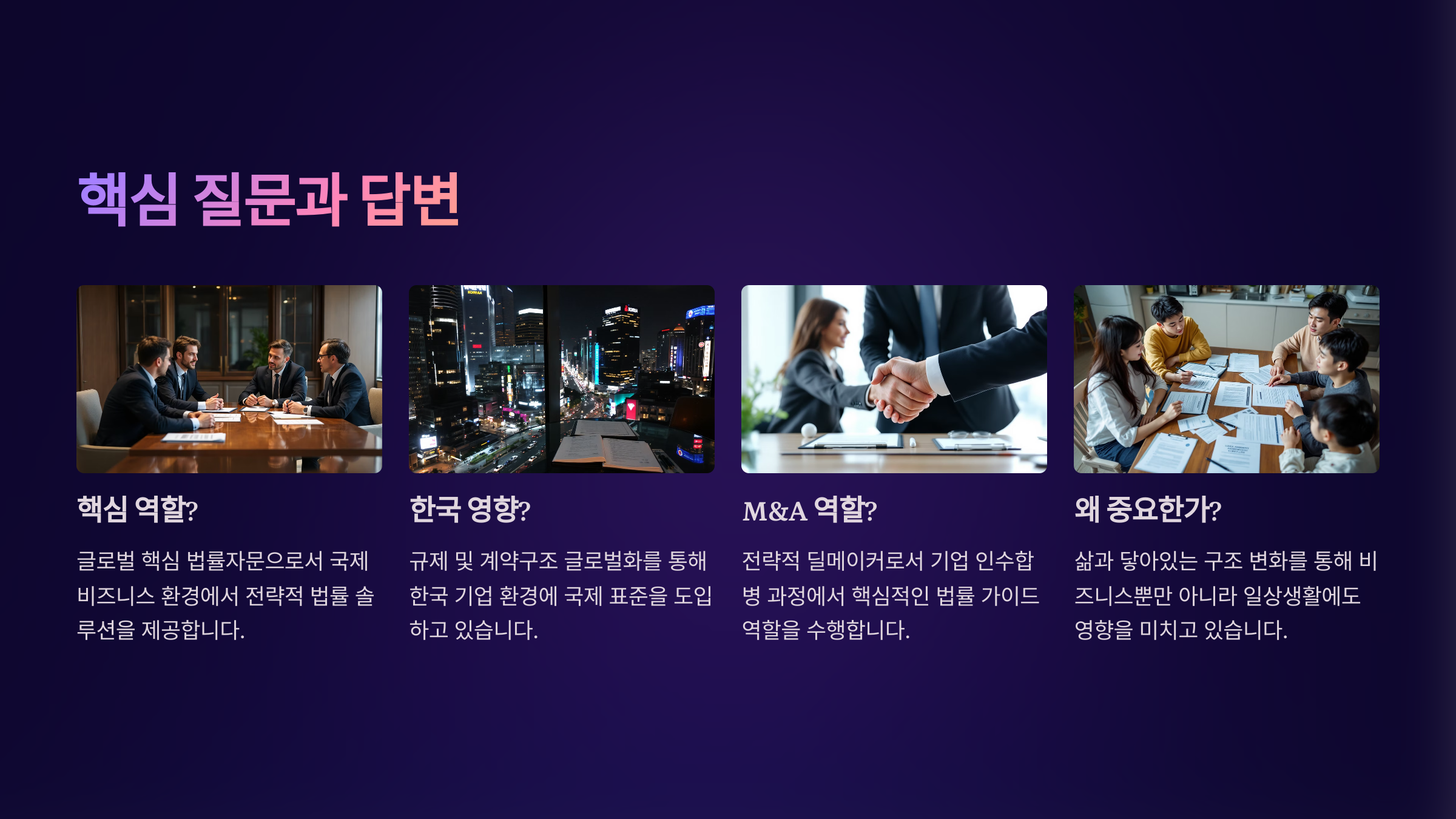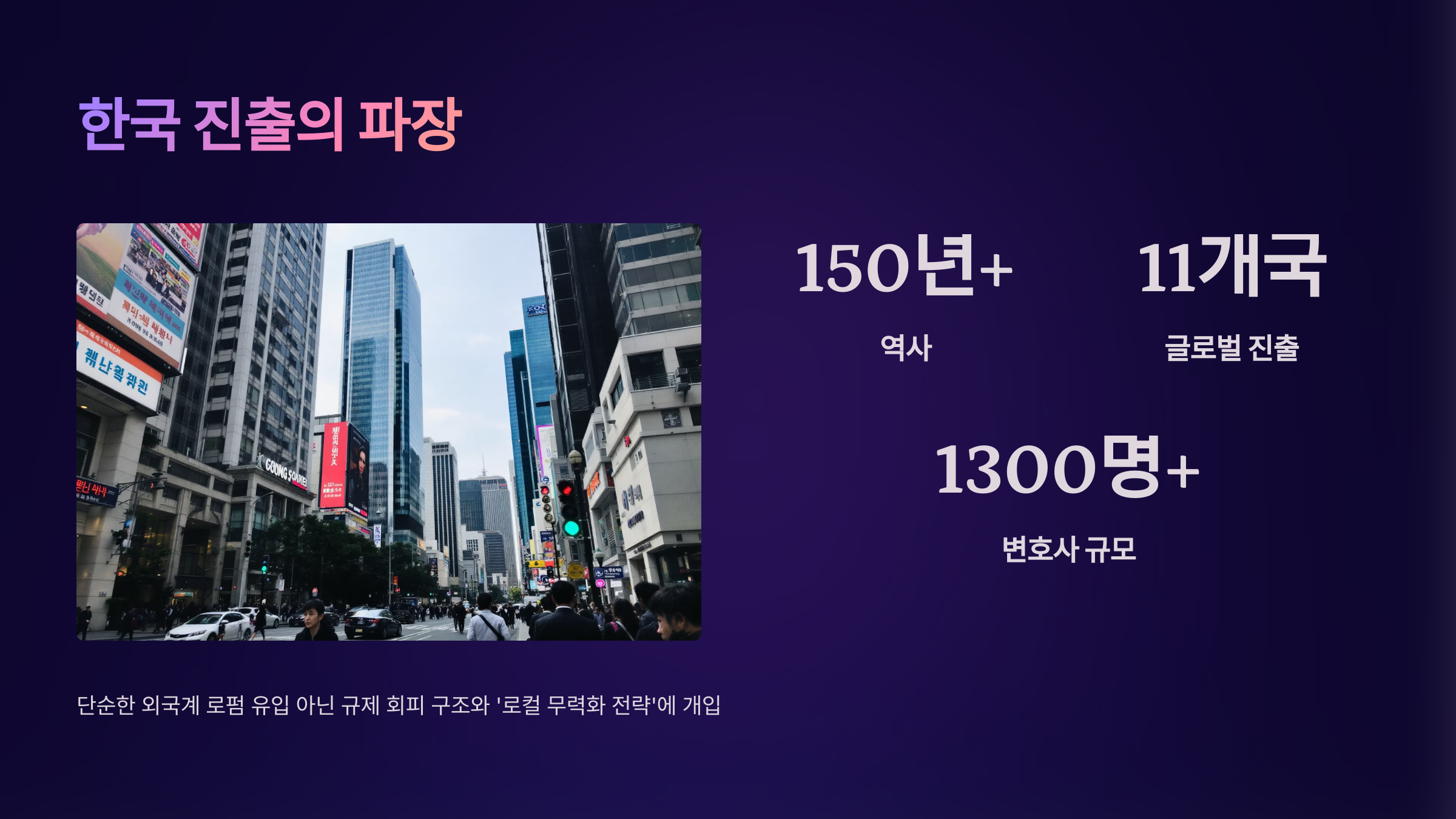 | 해외 로펌과의 조인트벤처 설립 | 해외 자문 수요 흡수, 고객 유지율 증가 |