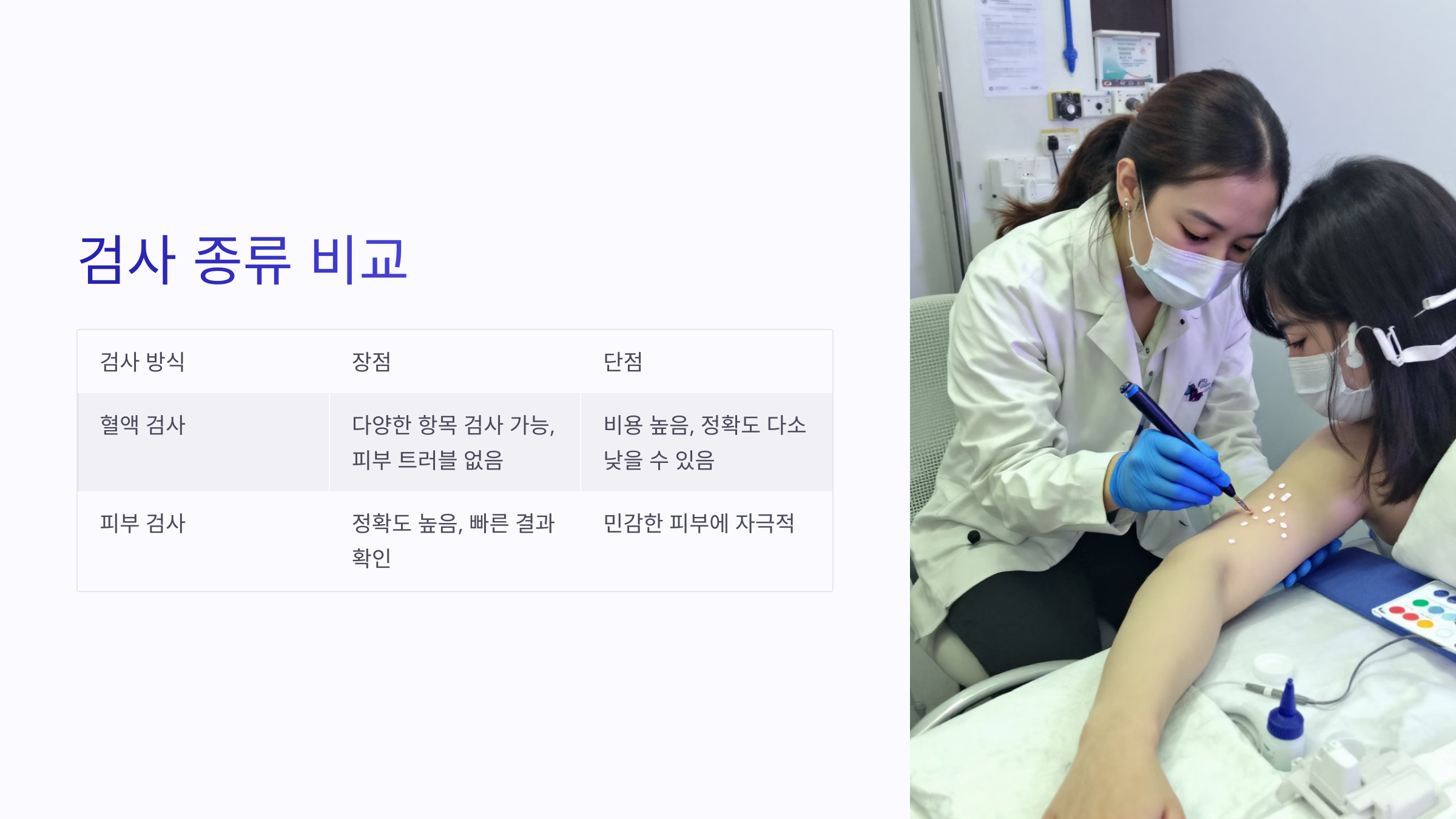 | 피부 검사 | 정확도가 높고 빠른 결과 확인 가능 | 민감한 피부엔 자극적일 수 있음 |