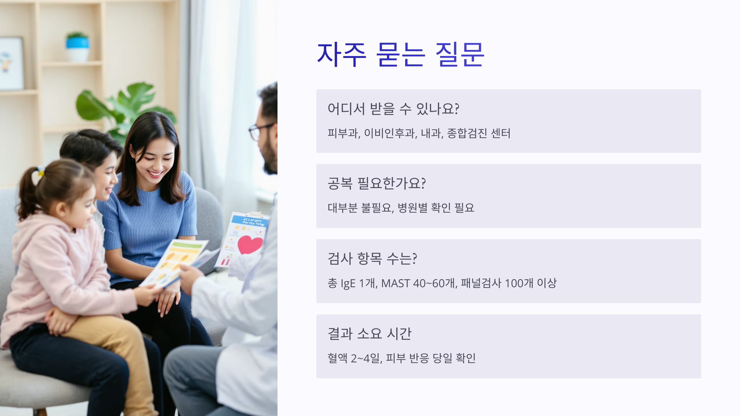 혈액 검사는 보통 2~4일, 피부 반응 검사는 당일 확인 가능해요. 종합 병원은 시간이 조금 더 걸릴 수 있어요.