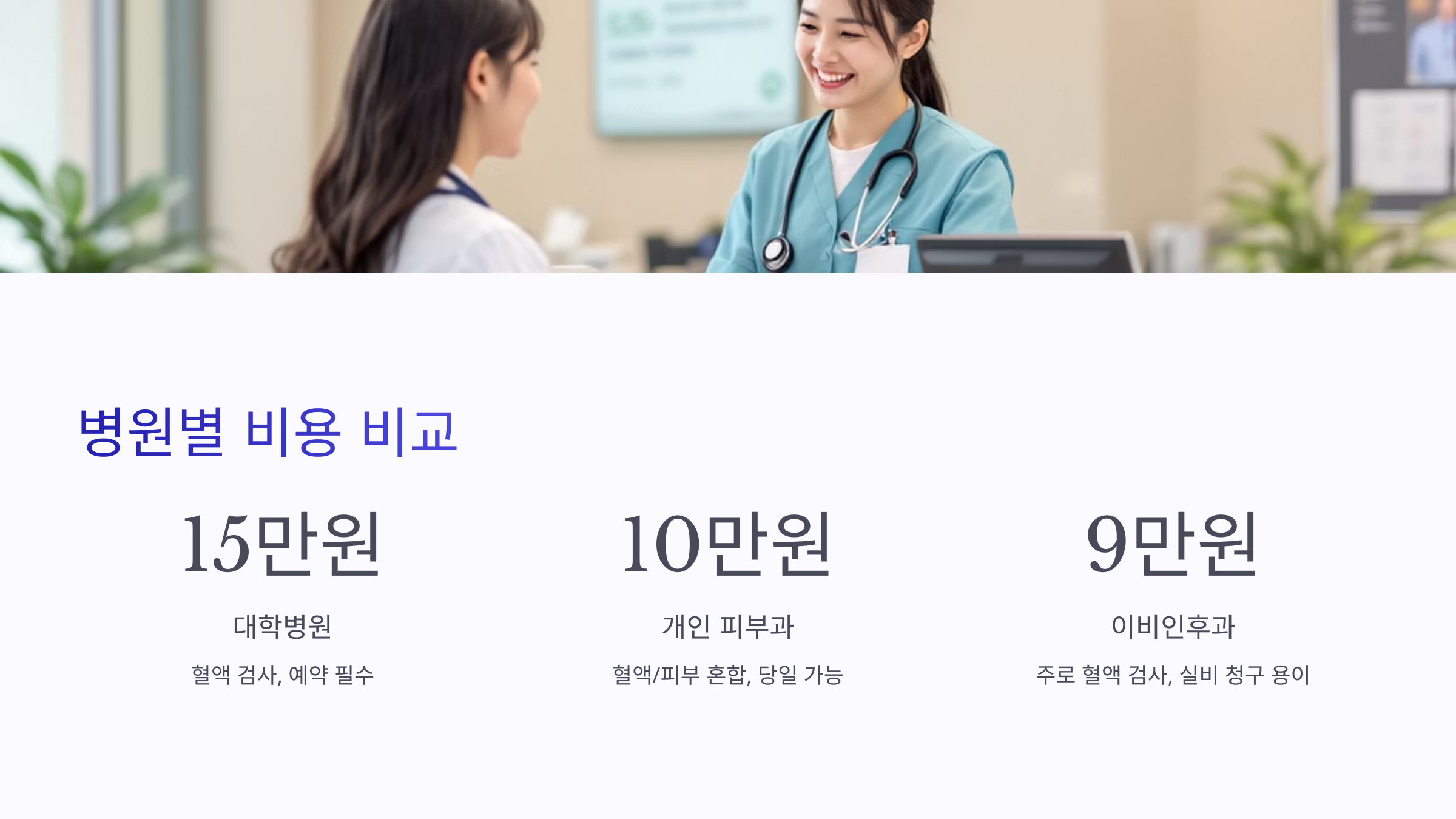 - 개인 피부과: 평균 6~10만 원 (혈액/피부 혼합 가능, 당일 검사 가능)