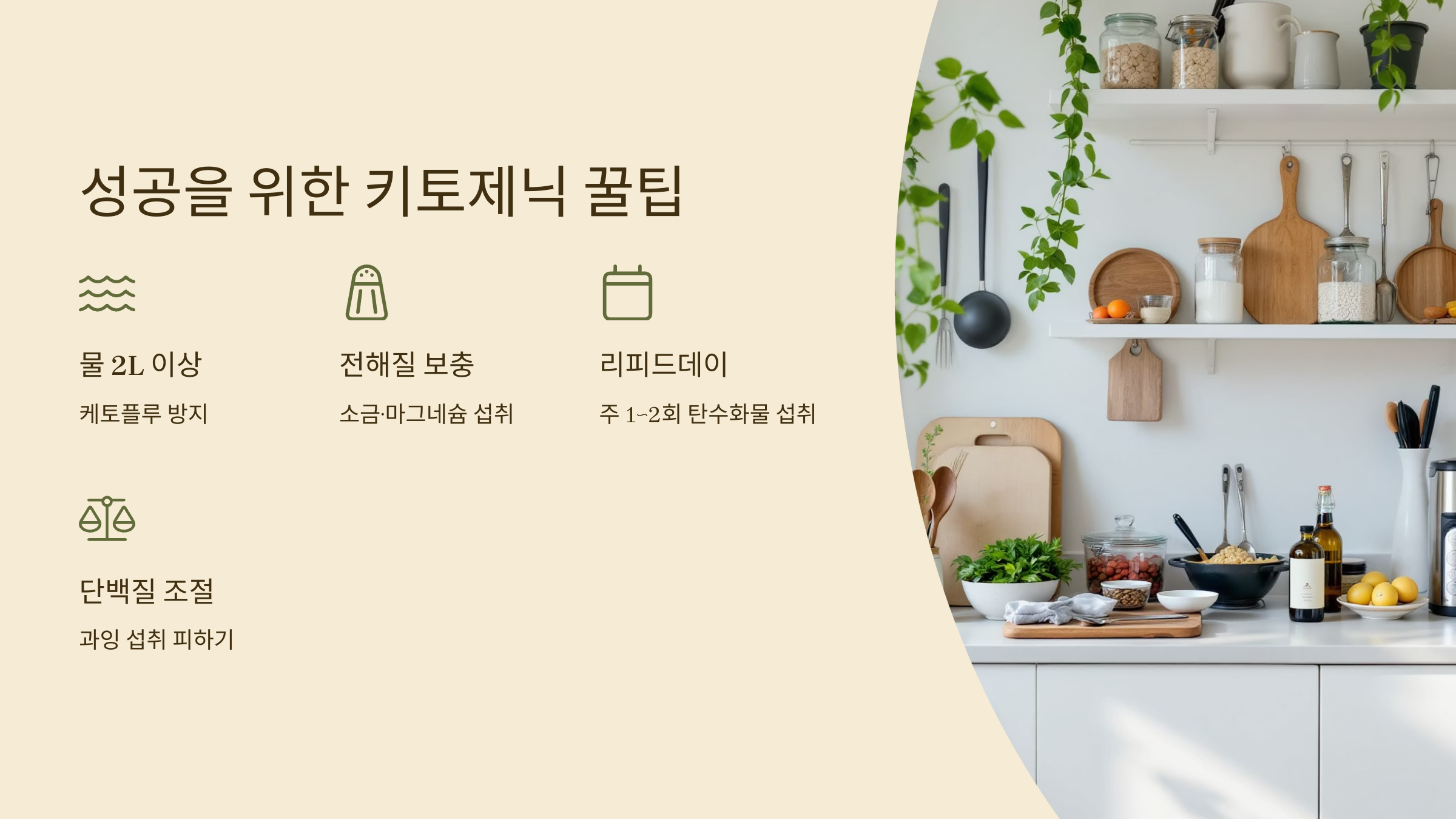 - 하루 물 2L 이상 마시기 (케토플루 방지!)