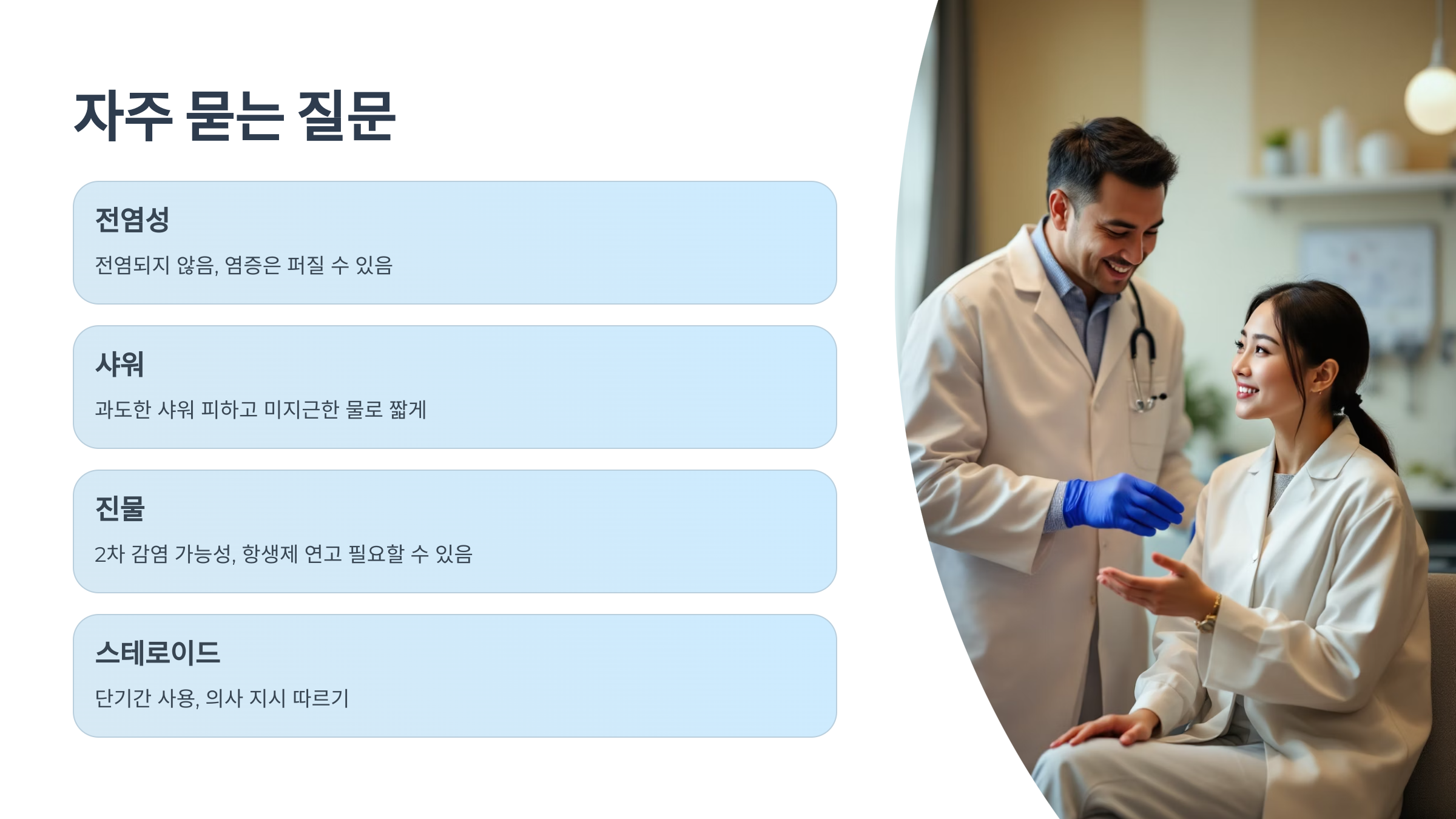 | 국소 스테로이드제 | 염증 부위에만 바르고, 장기 사용은 피해야 함 |