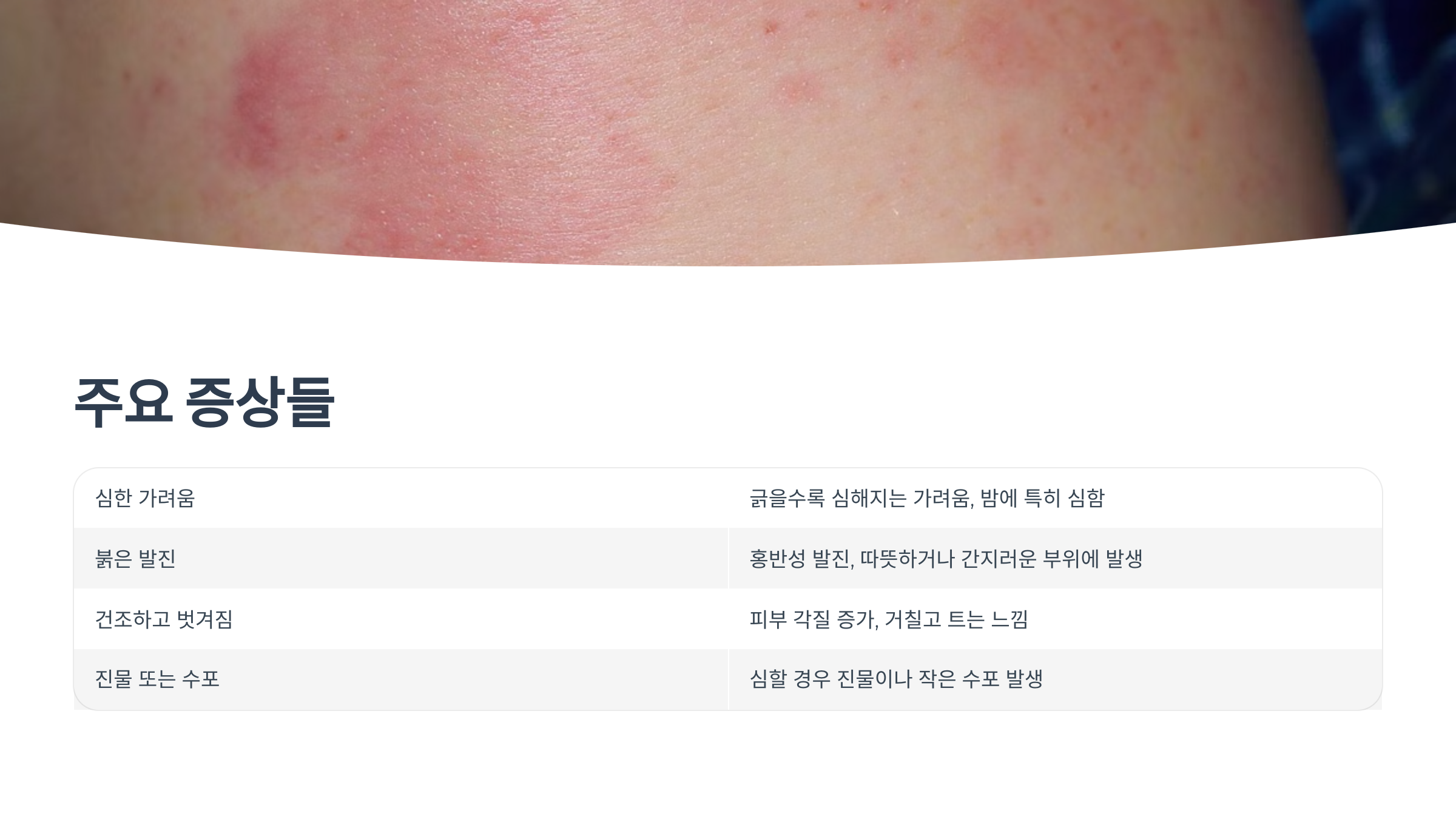 | 심한 가려움 | 긁을수록 심해지는 가려움, 밤에 특히 심함 |