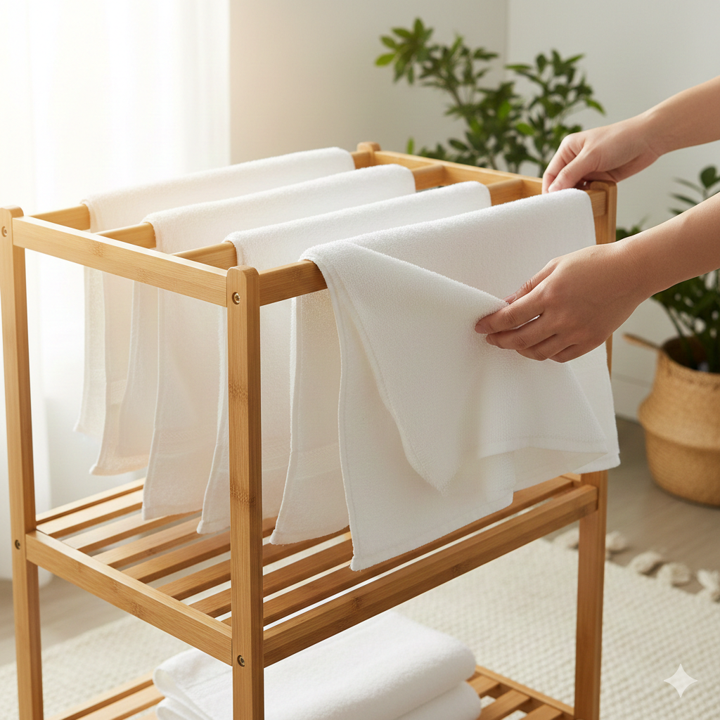 - 원목 건조대: 물기는 반드시 제거하고 햇볕이 잘 드는 곳에서 자주 통풍시켜 주세요. 습한 욕실보다는 건조한 거실이나 발코니가 좋아요.