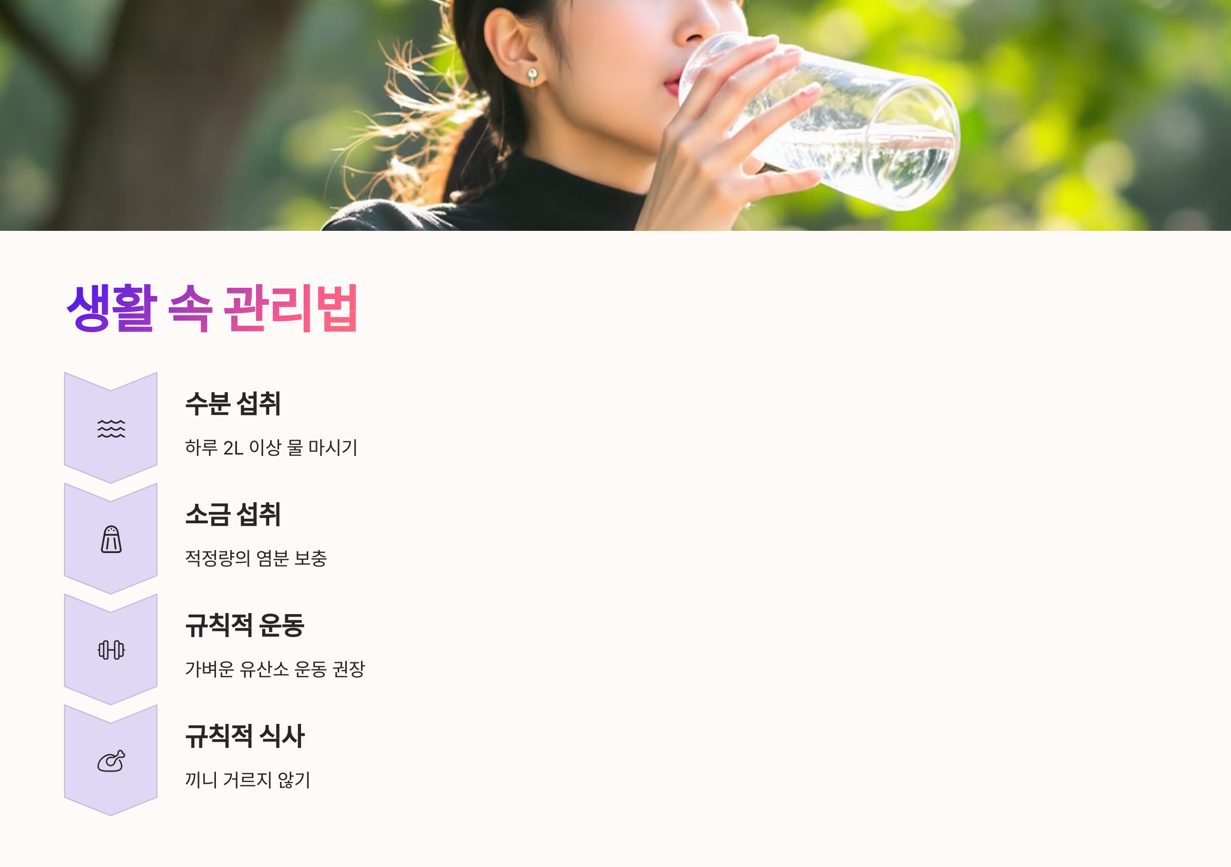 소금 섭취, 수분 보충, 규칙적 운동이 효과적입니다.