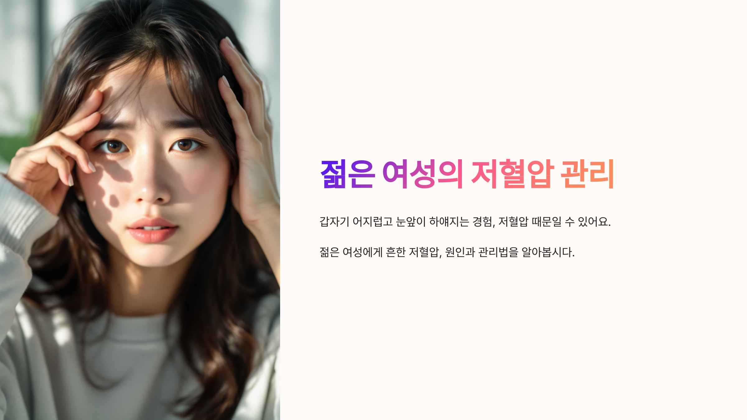 여러분, 혹시 갑자기 어지럽고 눈앞이 하얘지거나, 앉았다 일어났을 때 휘청거리신 적 있으신가요? 이런 현상, 특히 젊은 여성에게 많이 나타나는 저혈압일 수 있습니다. 단순히 '혈압이 낮아서 좋은 거 아닌가요?'라고 생각하기 쉬운데요, 그렇지 않습니다. 특히 일상생활에 지장이 있을 정도의 증상이라면, 원인을 정확히 파악하고 관리하는 것이 무엇보다 중요합니다. 오늘은 젊은 여성들이 자주 겪는 저혈압의 다양한 원인과 올바른 관리법에 대해 아주 쉽고 친절하게 풀어보겠습니다