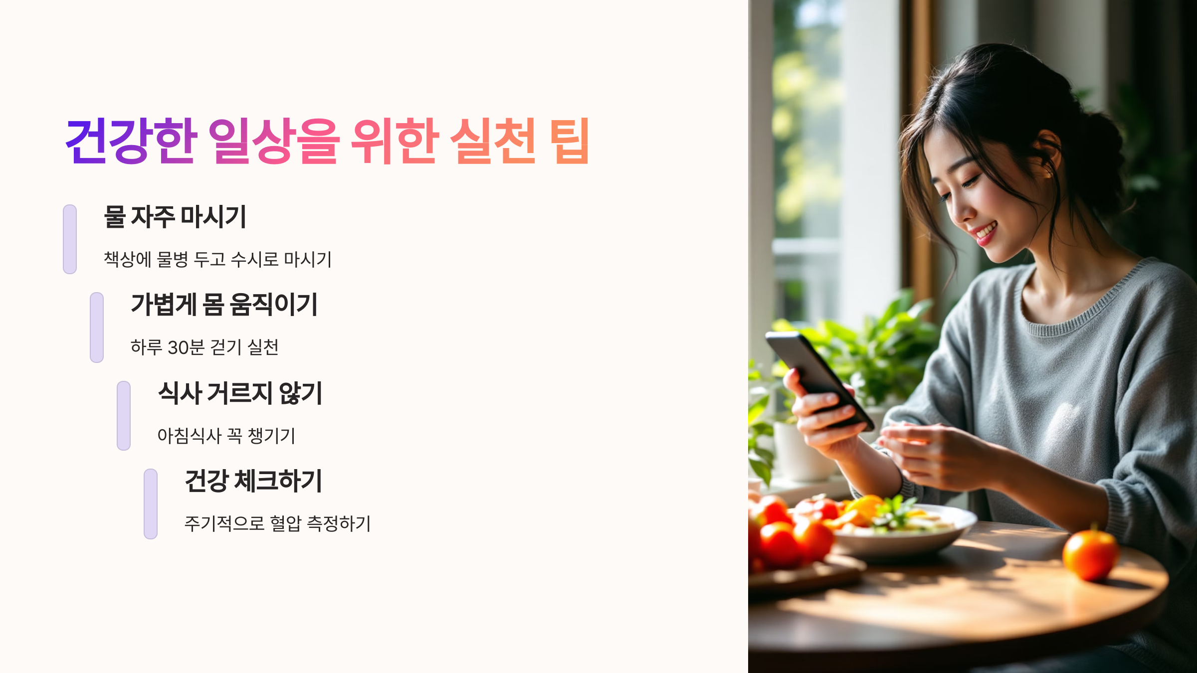 오늘 소개해드린 저혈압에 대한 이야기는 평소에 간과하기 쉬운 부분이지만, 실제로 일상생활에서 겪는 여러 불편함의 원인이 될 수 있습니다. 특히 젊은 여성분들은 무심코 넘기지 마시고, 자신의 생활 패턴과 몸 상태를 꾸준히 살펴보시는 것이 중요합니다. 건강은 작은 실천에서부터 시작됩니다. 물을 조금 더 자주 마시고, 가볍게 몸을 움직이고, 식사를 거르지 않는 것만으로도 달라질 수 있어요. 앞으로도 여러분의 건강한 하루를 위해 유익한 정보들로 다시 찾아오겠습니다. 함께 건강해져요!