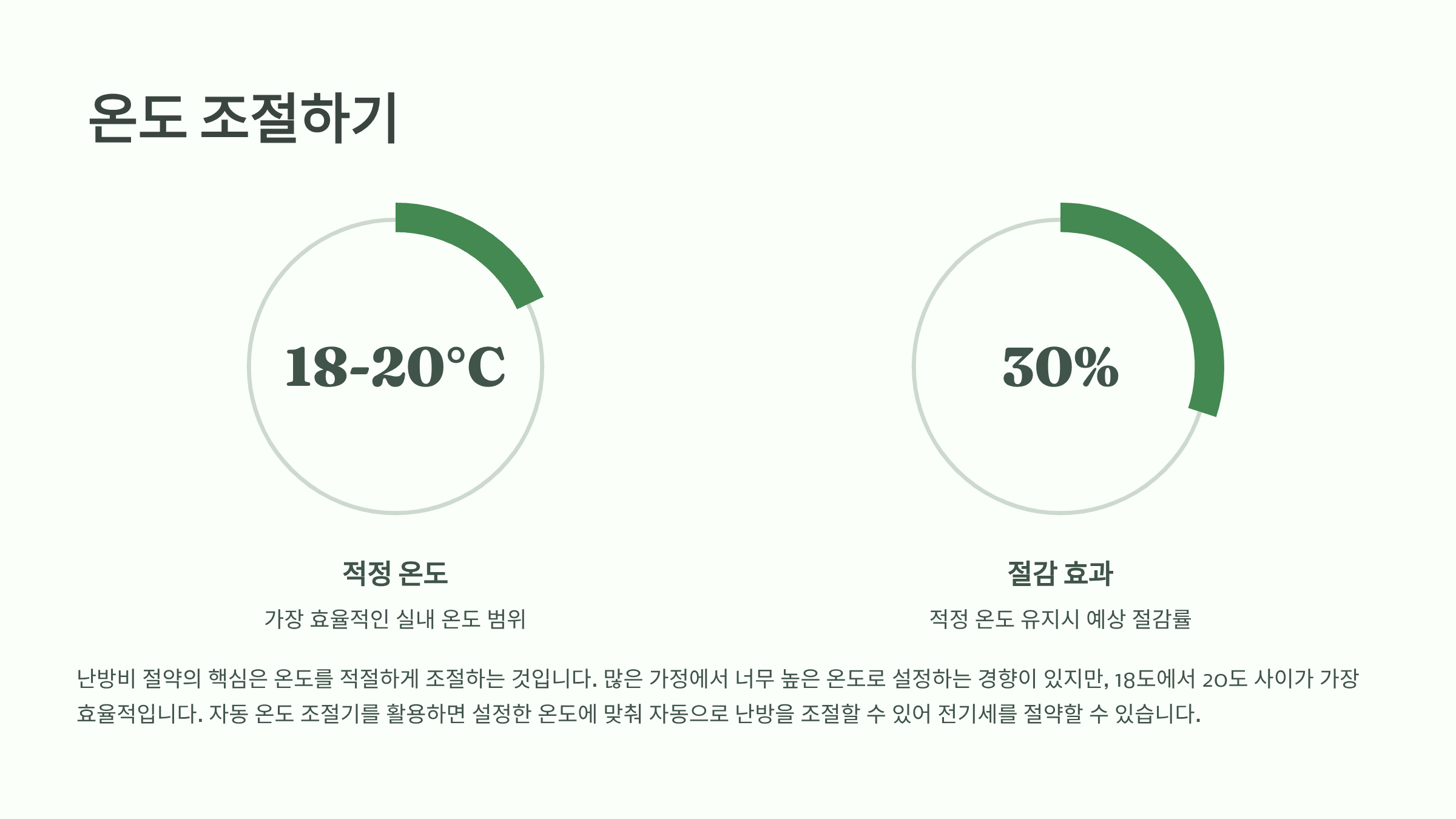 난방비 절약의 핵심 중 하나는 온도를 적절하게 조절하는 것입니다. 많은 가정에서 난방을 할 때 너무 높은 온도로 설정하는 경향이 있습니다. 그러나 적정 온도는 18도에서 20도 사이가 가장 효율적입니다. 이러한 온도를 유지하면 체온 유지에도 적합하고, 에너지 소모를 최소화할 수 있습니다.
