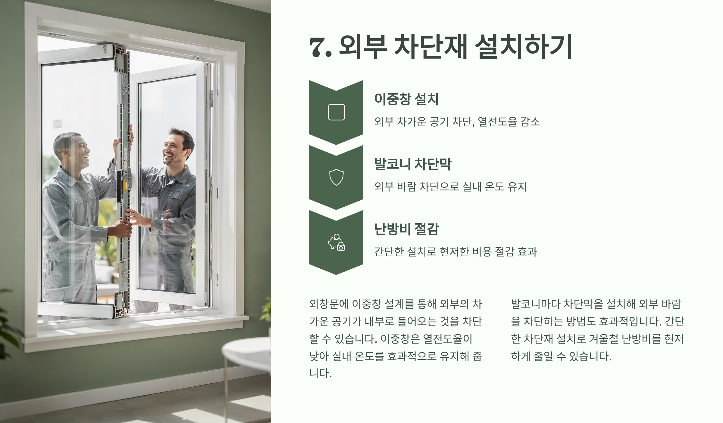마지막으로, 외부 차단재를 설치하는 것도 난방비 절약에 도움이 됩니다. 예를 들어, 외창문에 이중창 설계를 통해 외부의 차가운 공기가 내부로 들어오는 것을 차단할 수 있습니다. 이중창은 열전도율이 낮아 실내 온도를 효과적으로 유지해 줍니다.