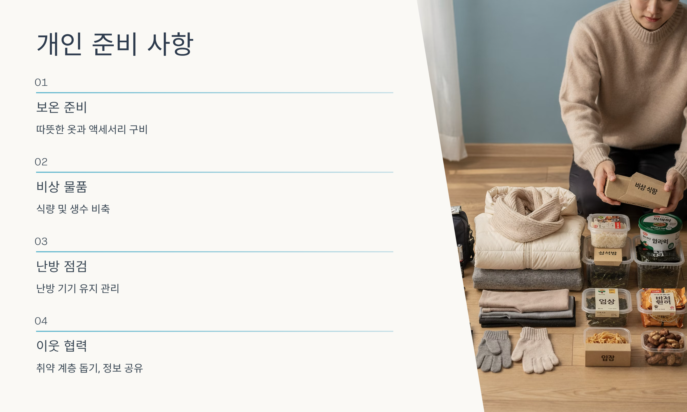 미리 따뜻한 옷을 준비하고, 비상 식량 및 생수를 비축하는 것이 중요합니다. 또한, 난방 기기와 관련된 안전 점검도 필요합니다.