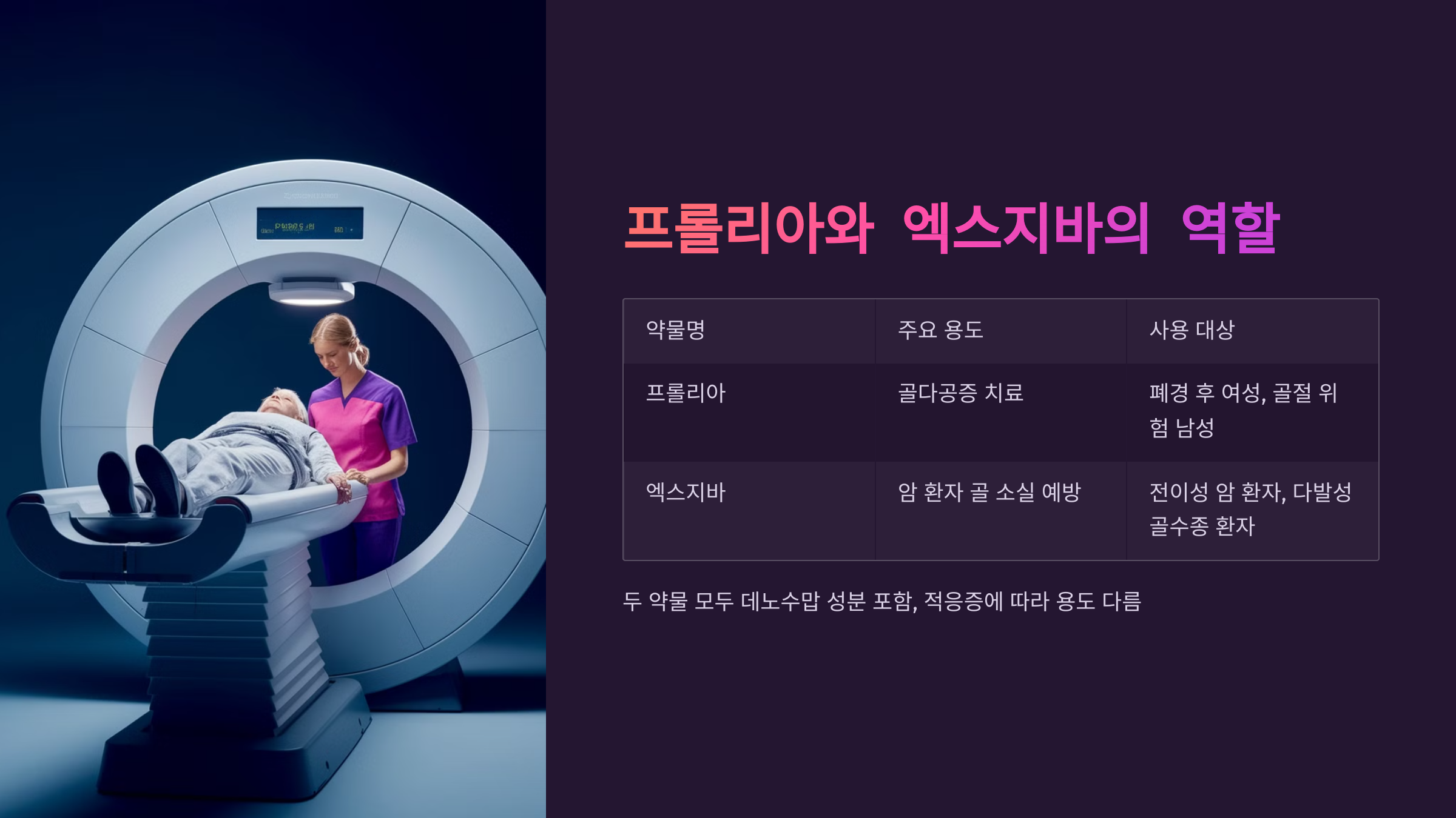 | 프롤리아 (Prolia) | 골다공증 치료 | 폐경 후 여성, 골절 위험이 높은 남성 |