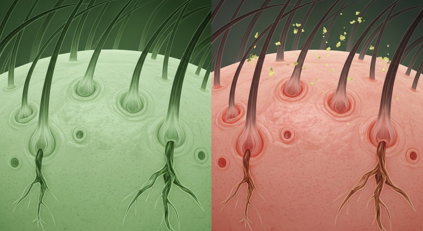 비듬, 가려움, 각질 같은 증상들은 대부분 두피 염증과 관련이 깊어요. 이 염증이 만성화되면 모발을 생성하는 모낭 세포에 직접적인 손상을 주게 됩니다. 염증으로 인해 모낭 주변의 혈액순환이 나빠지고 영양 공급이 원활하지 못해지면, 모낭은 점차 약해지고 위축되기 시작해요.
