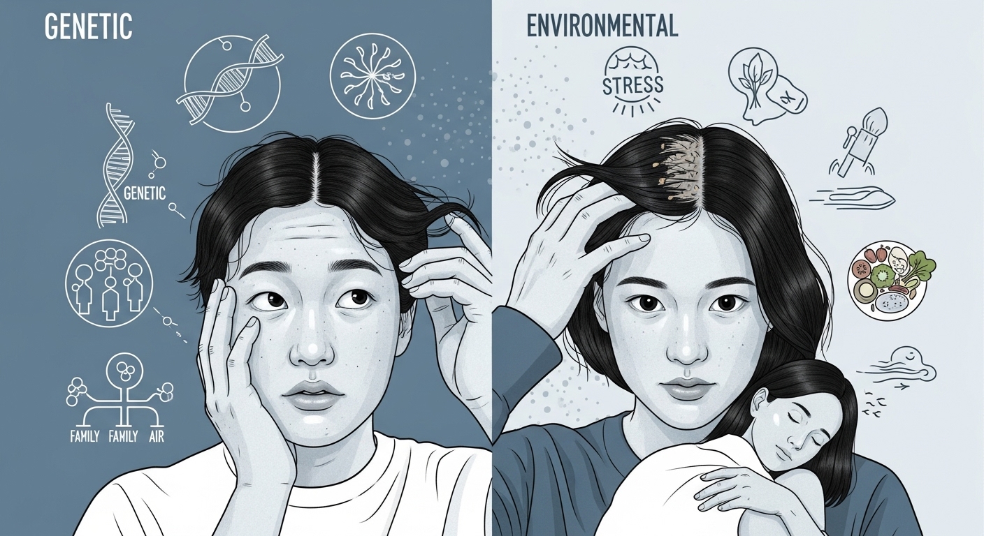 | 주요 원인 | DHT에 민감한 모낭, 특정 유전자 발현 | 스트레스, 불균형 식단, 수면 부족, 외부 오염, 잘못된 두피 관리, 흡연/음주 |