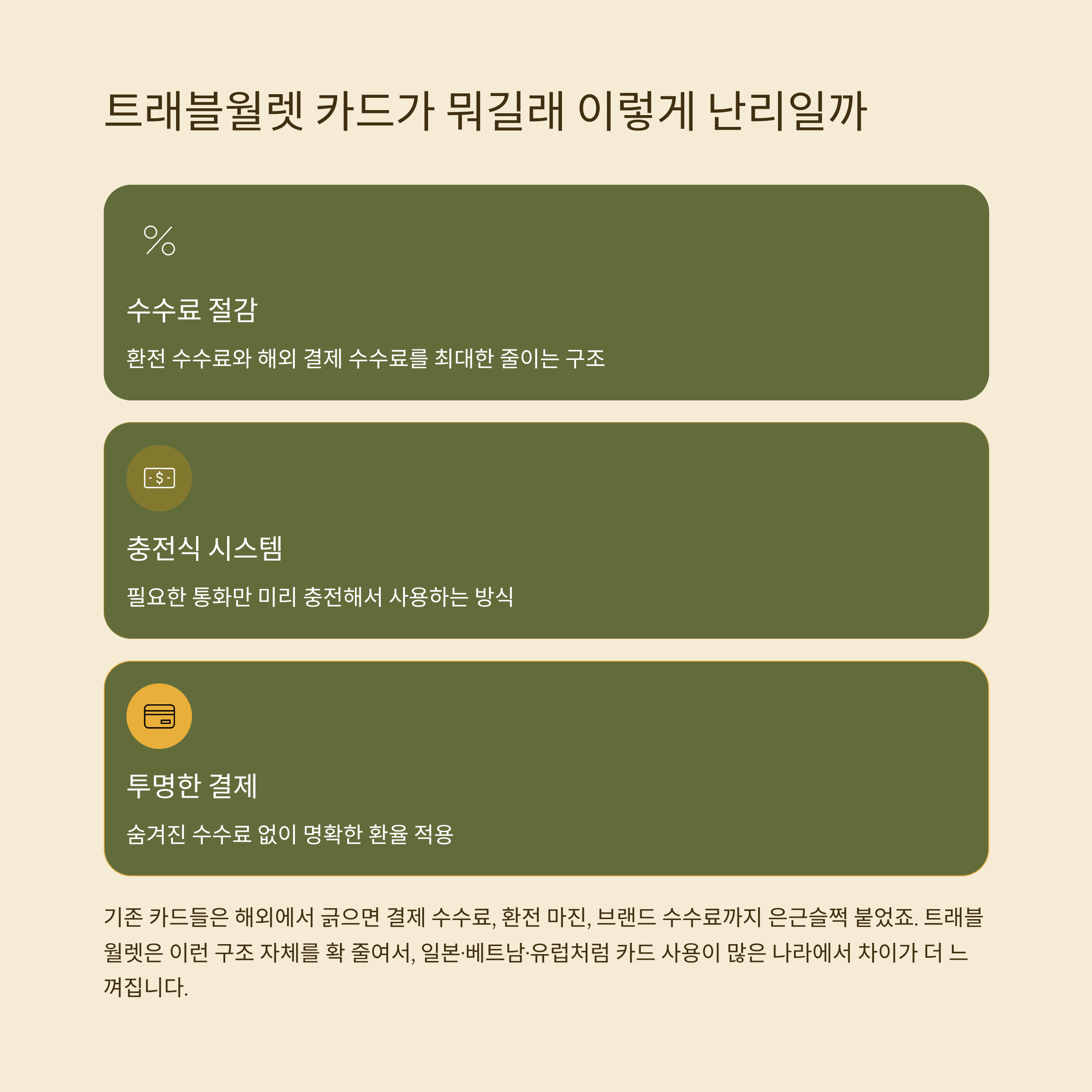 정리해보면 이렇습니다. 트래블월렛 카드는 “최고의 카드”라기보다는,