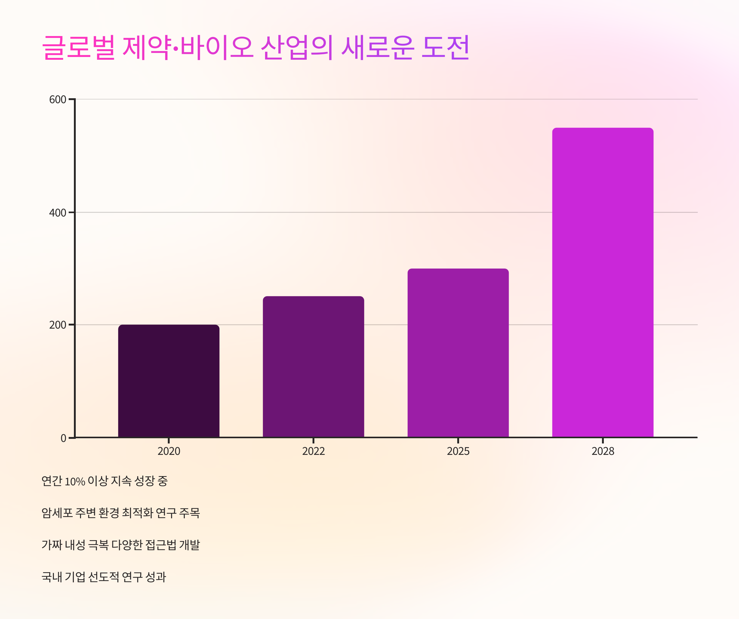 지금 세계 항암제 시장은 300조 원 규모이며, 매년 10% 이상씩 성장해 2028년에는 무려 550조 원에 이를 전망입니다. 기존 항암제의 침투를 도와주는 보조제 성격의 치료법은 글로벌 제약사들이 특히 선호하는 분야입니다. 그만큼 국내 기술에 대한 협업 기회와 수출 가능성도 아주 높아졌죠.