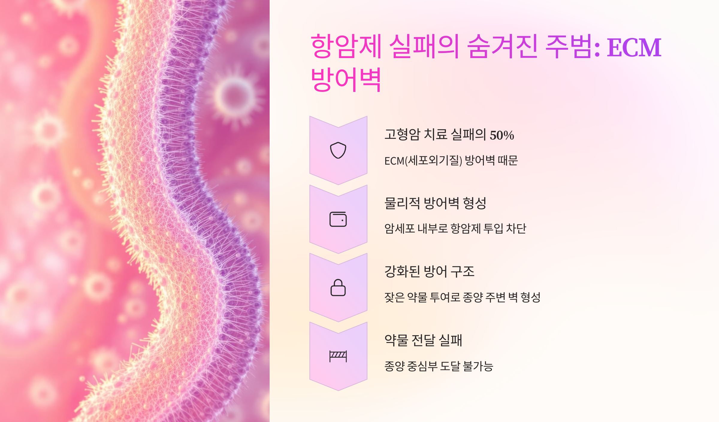 연구에 따르면, 암세포 외부에 있는 ECM(세포외기질)이 마치 방어벽처럼 작용하여 약물이나 면역세포의 침투를 막고 있었습니다. 약이 암세포에 도달하기도 전에 길을 잃는 셈이죠.