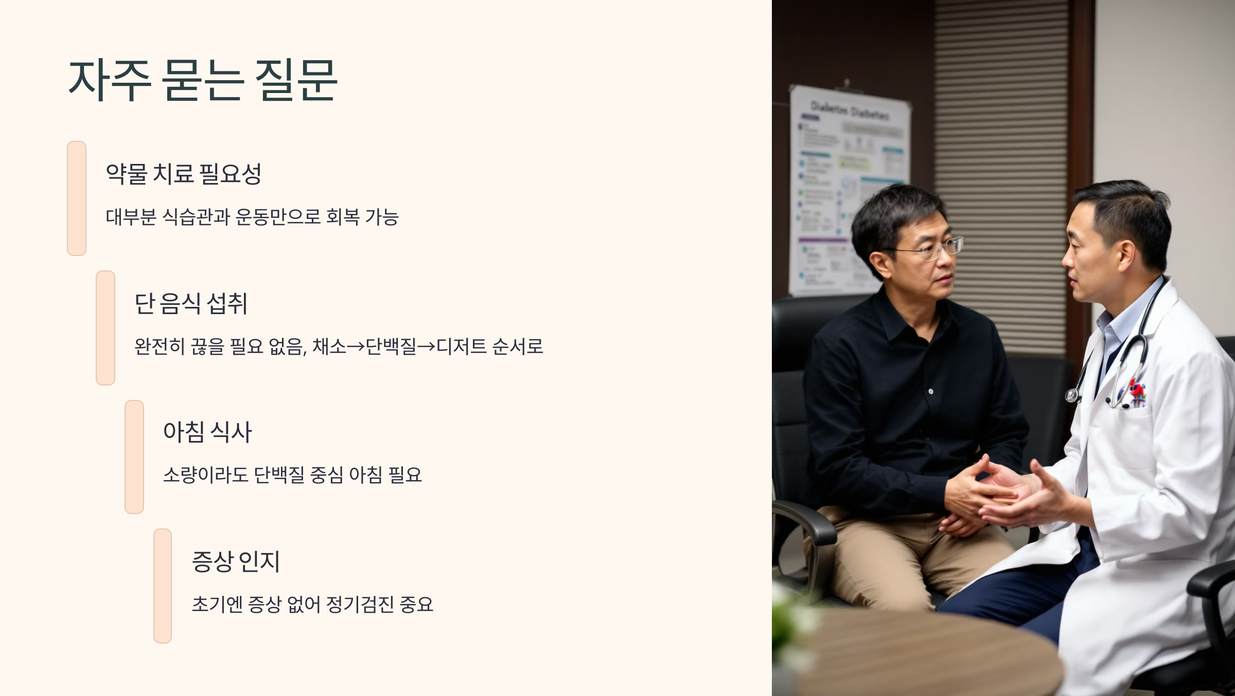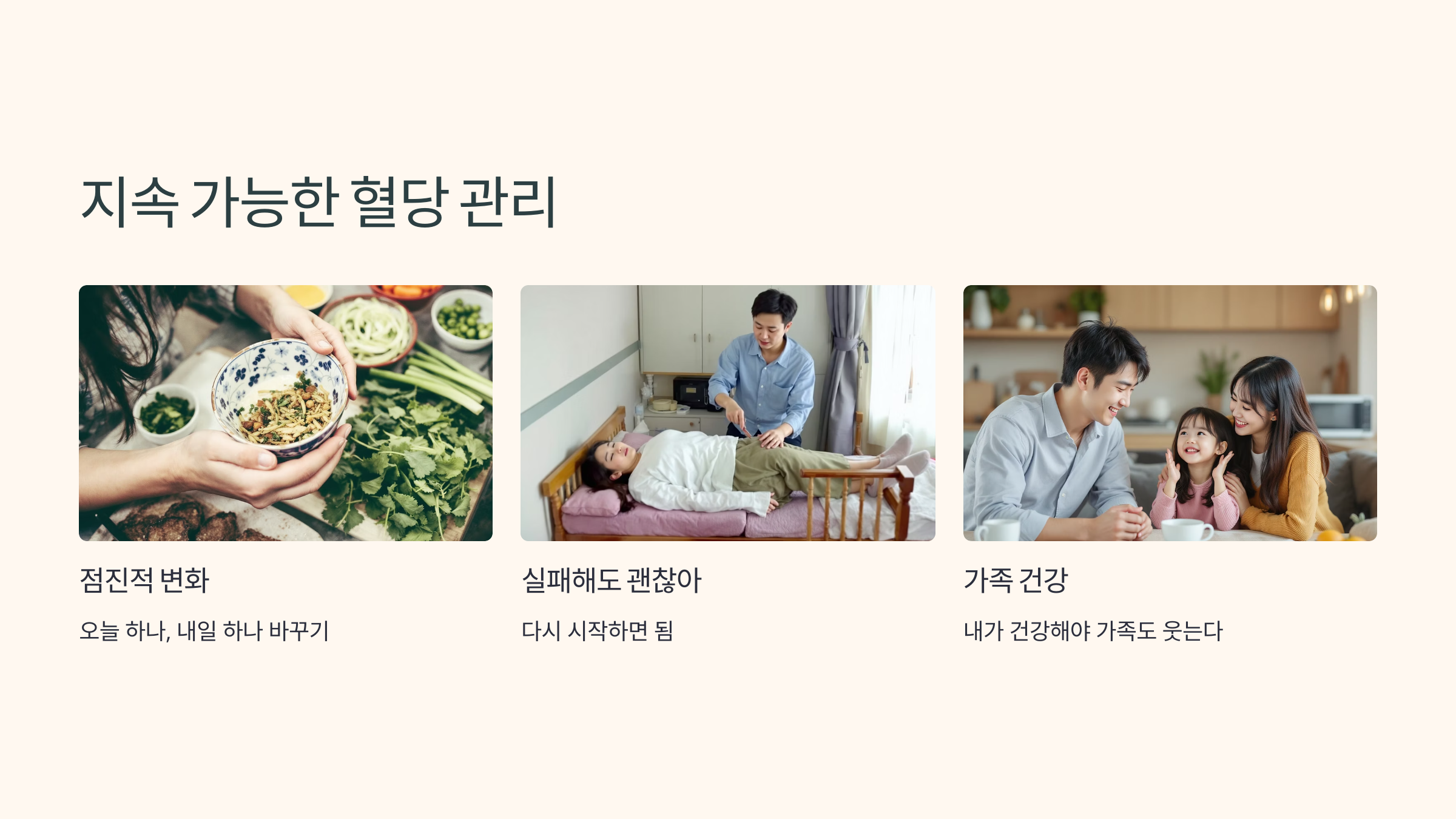 당뇨는 조절 가능한 병입니다. 그리고 그 시작은 오늘 내 밥상과 걷기 한 번에서 시작됩니다.