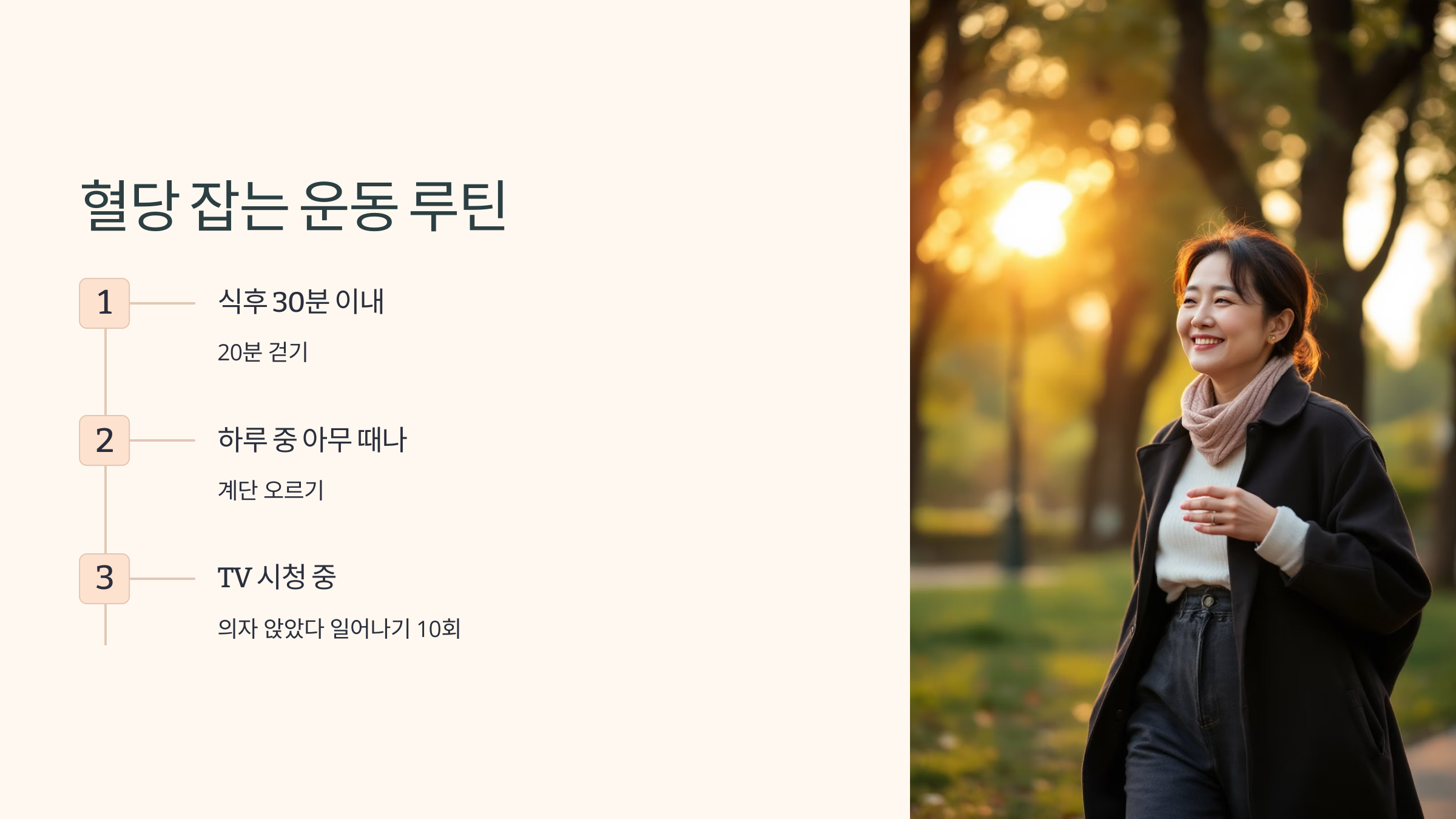 | 식후 30분 이내 | 20분 걷기 | 집 근처 공원 or 아파트 단지에서 걷기 |
