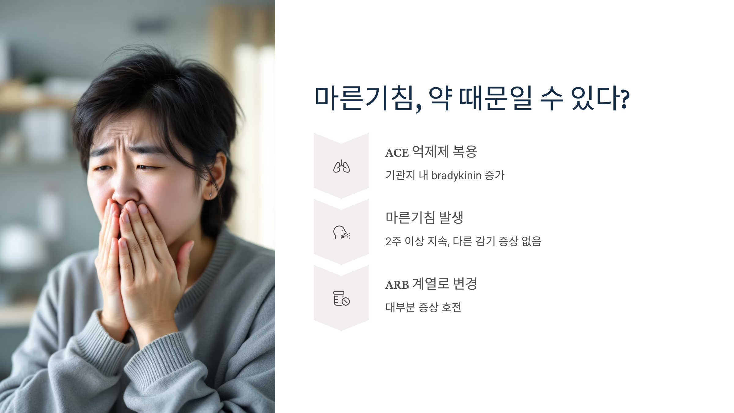 감기도 아닌데 계속 마른기침이 난다면? ACE 억제제가 범인일 수 있어요. 이 계열 약물은 기관지 내 bradykinin을 증가시켜 기침 반사를 유발합니다.