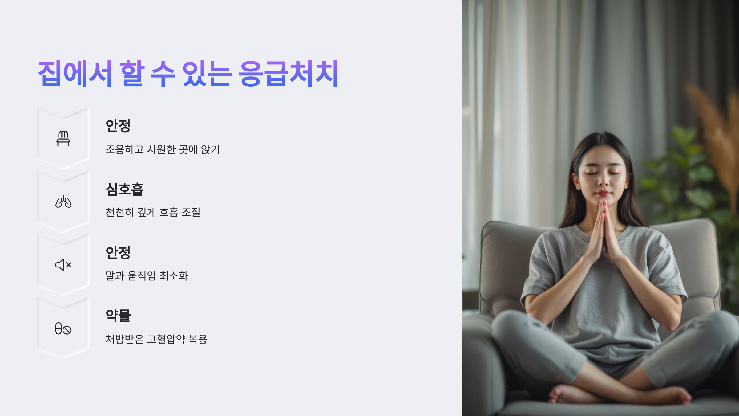 갑작스러운 혈압 상승이 의심될 때, 집에서 당장 할 수 있는 대처법들을 정리해봤어요. 아래 방법은 병원에 가기 전 짧은 시간 동안 위험을 줄여주는 데 도움을 줄 수 있습니다.