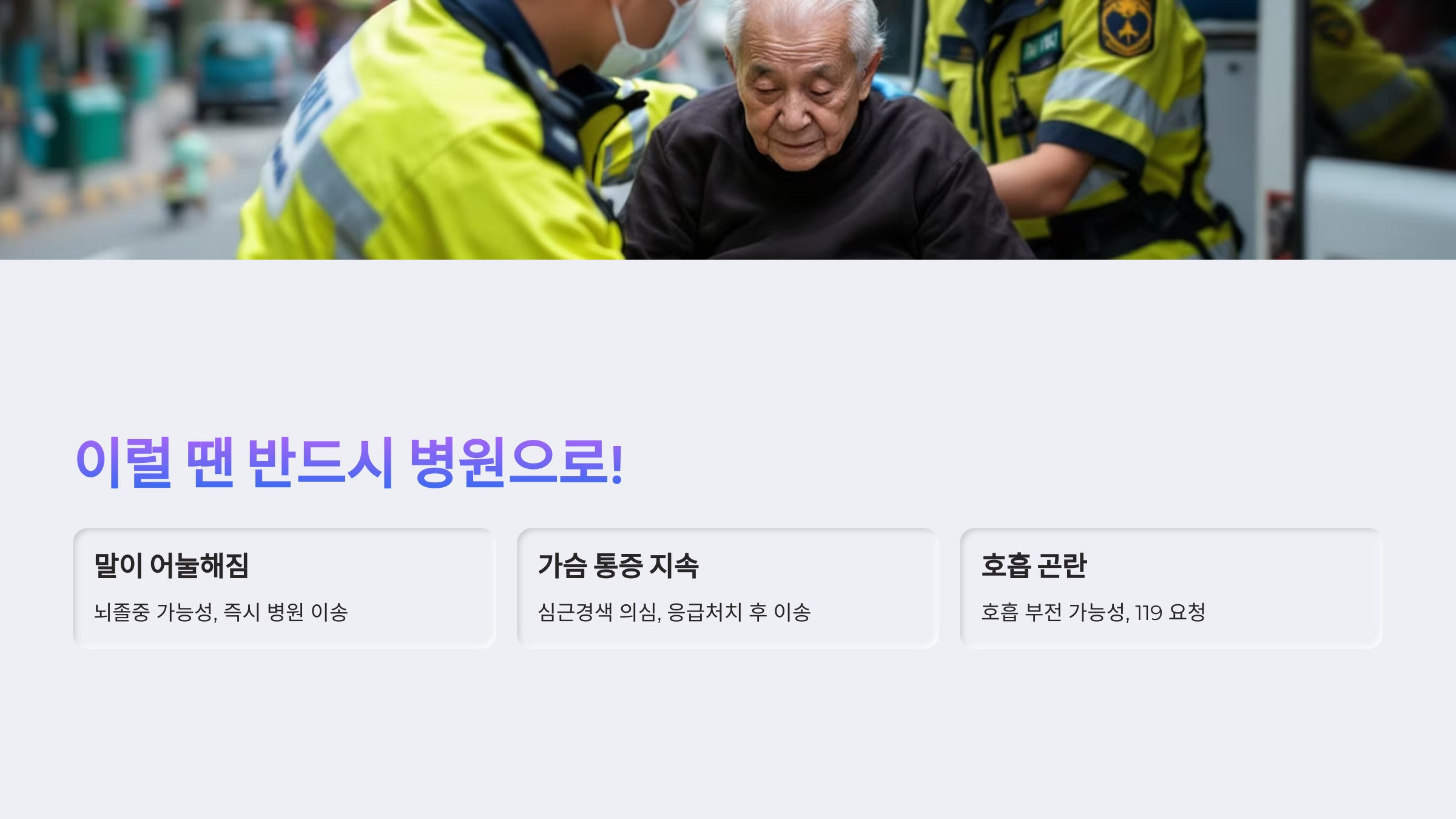 | 말이 어눌해지고 입이 돌아감 | 뇌졸중 가능성, 즉시 병원 이송 |
