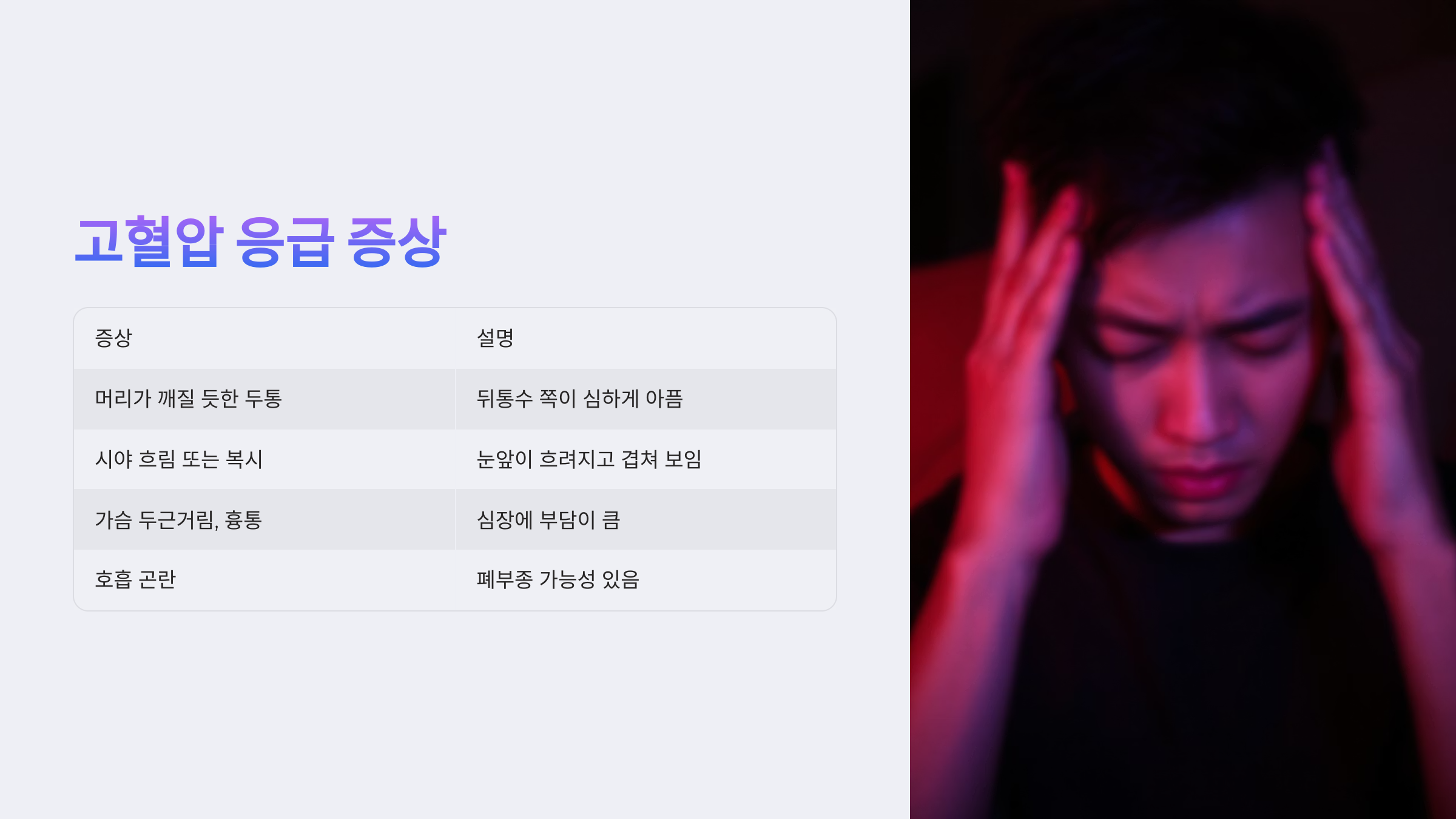 이런 상태는 뇌졸중, 심근경색 같은 생명을 위협하는 합병증을 유발할 수 있어서 반드시 즉각적인 대처가 필요합니다. 단순히 숫자가 높다고 해서 전부 위험한 건 아니지만, 증상과 함께 나타나면 응급 상황으로 간주해야 해요.
