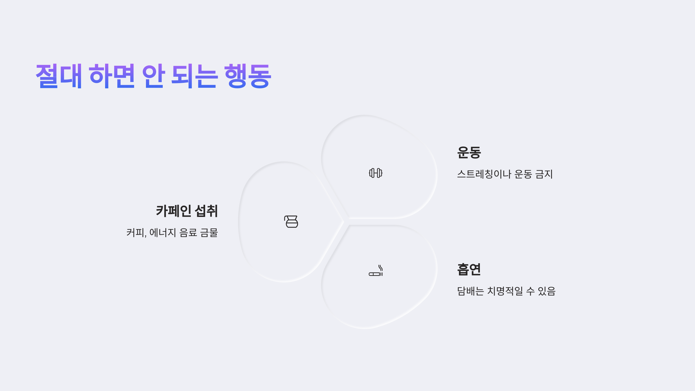 - 카페인 섭취 (커피, 에너지 음료 등)는 절대 금물입니다.