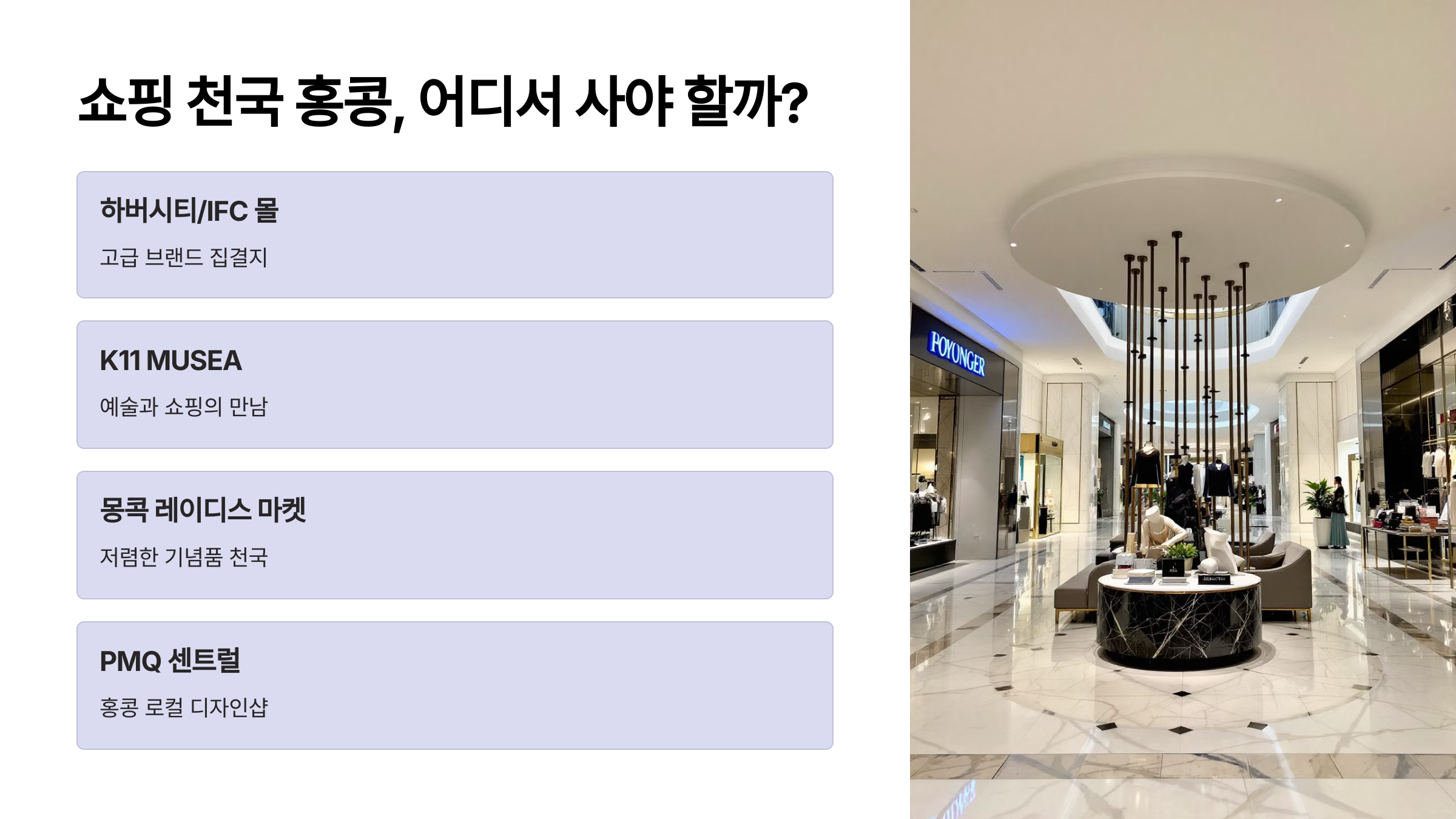 홍콩은 면세 쇼핑의 천국이죠. 명품부터 화장품, 기념품까지 없는 게 없어요. 하버시티(Harbour City)는 홍콩 최대 쇼핑몰로 하루 종일 돌아다녀도 다 못 봅니다. 저렴한 쇼핑을 원한다면 몽콕의 시장이나 샤틴 지역 아울렛을 추천드려요. 특히 세일 시즌에는 가격이 진짜 말도 안 되게 저렴해요. 아래는 쇼핑 장소와 특징 정리입니다.