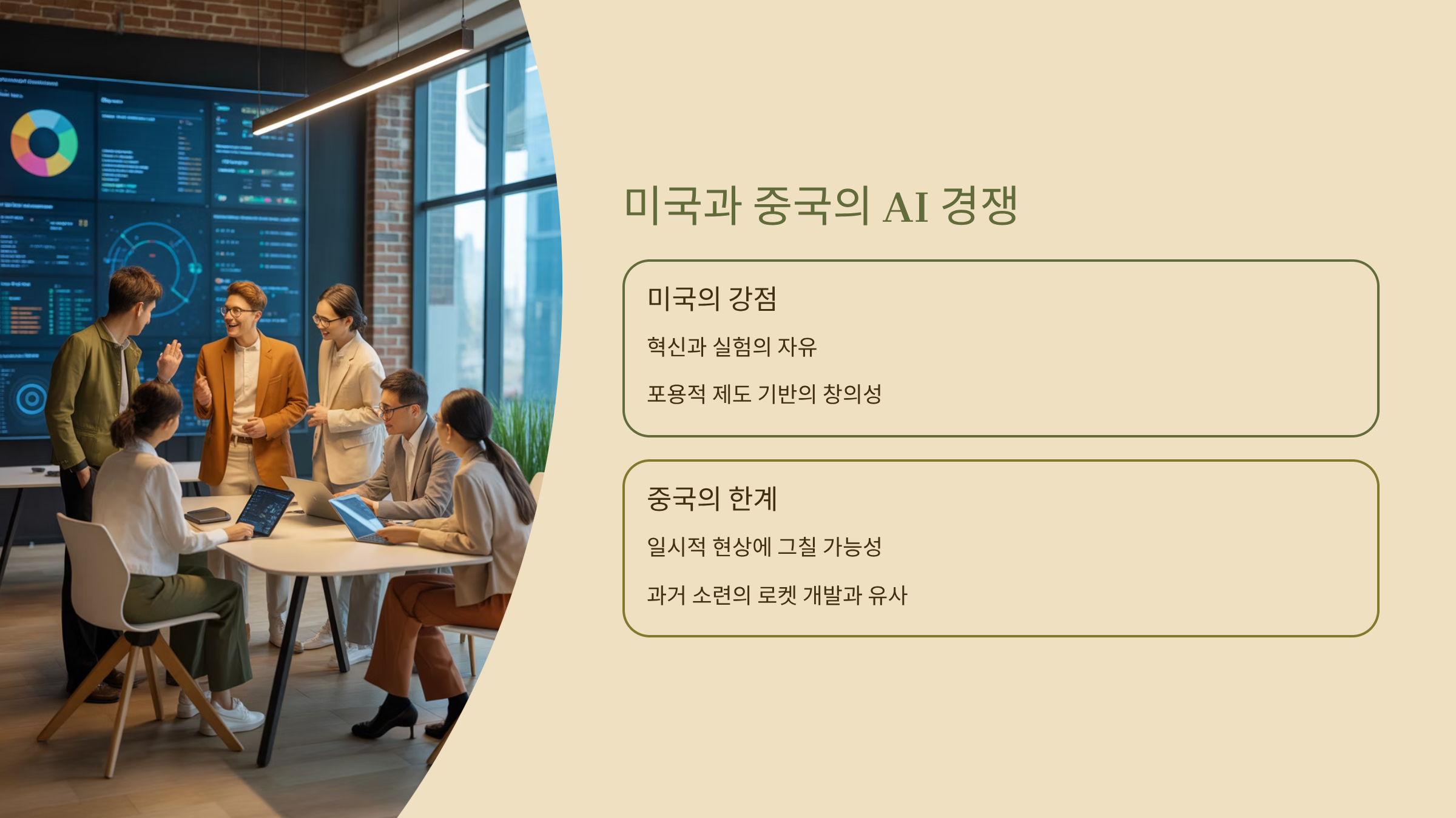 로빈슨 교수는 미국의 강점으로 **혁신과 실험의 자유**를 꼽았습니다. 반면 중국의 AI 발전은 과거 소련의 로켓 개발과 비슷하게, 일시적인 현상에 그칠 수 있다고 평가했어요. 저는 이 부분이 참 공감이 갔어요. 새로운 기술이나 아이디어는 자유로운 분위기에서 더 잘 나올 수밖에 없으니까요.