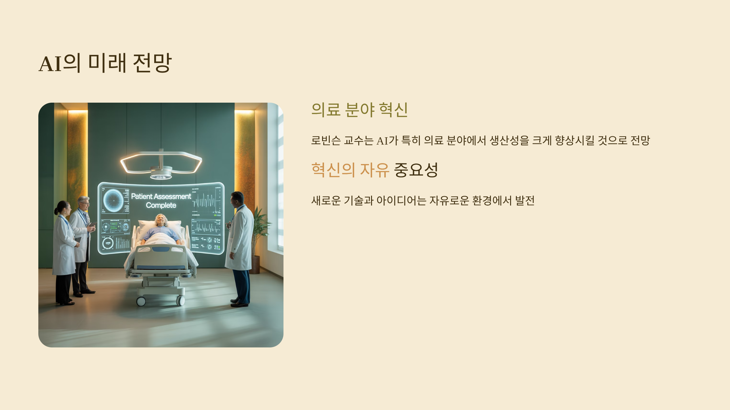 로빈슨 교수는 AI가 특히 **의료 분야**에서 생산성을 크게 향상시킬 것이라고 전망했습니다.