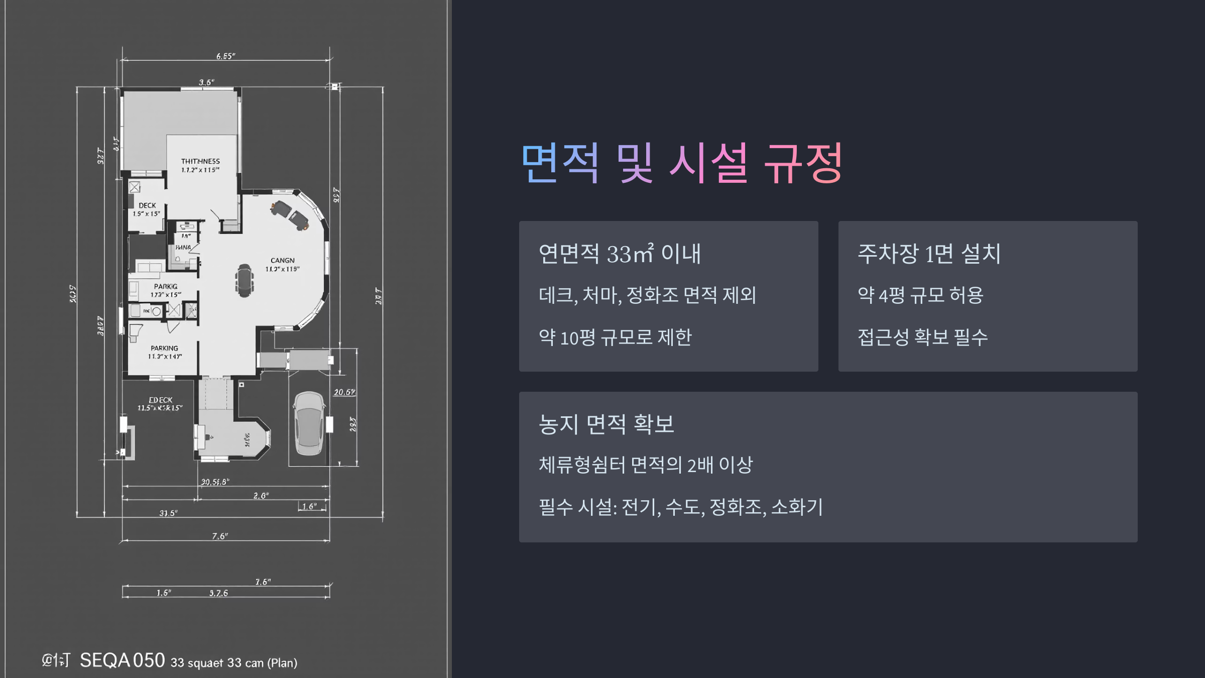 쉼터 및 부속 시설 연면적의 두 배 이상 면적의 농지를 확보해야 합니다. 주차장, 데크, 정화조 면적까지 포함하여 계산합니다.