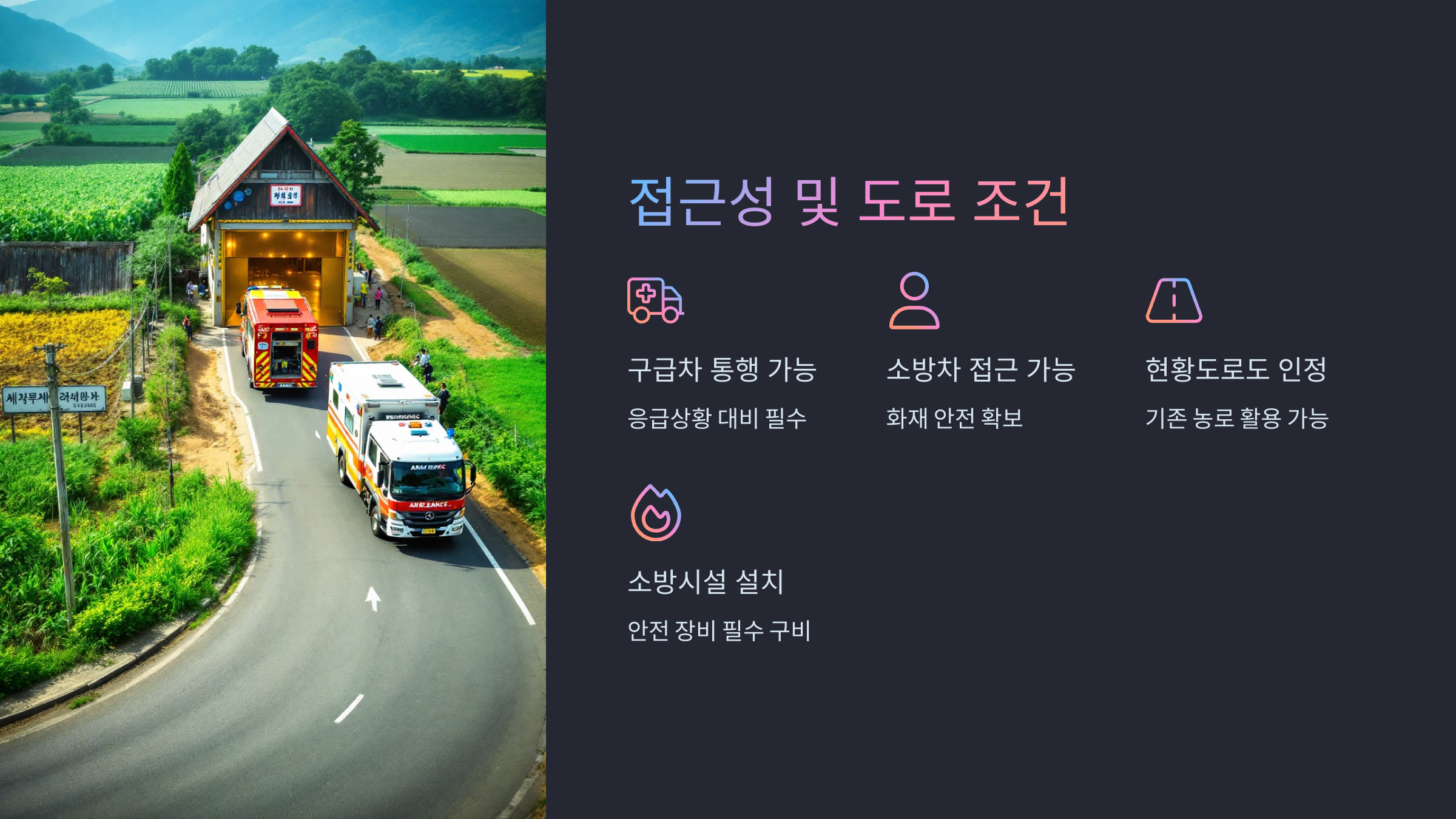 안전은 아무리 강조해도 지나치지 않죠. 쉼터는 소방차 진입이 가능한 도로에 접한 농지여야 합니다. 여기엔 사실상의 통로(농도, 면도 등)도 포함되지만, 임도는 해당되지 않습니다. 또한 쉼터와 부속시설의 면적의 두 배 이상의 농지 면적이 필요하니 절대 잊지 마세요!