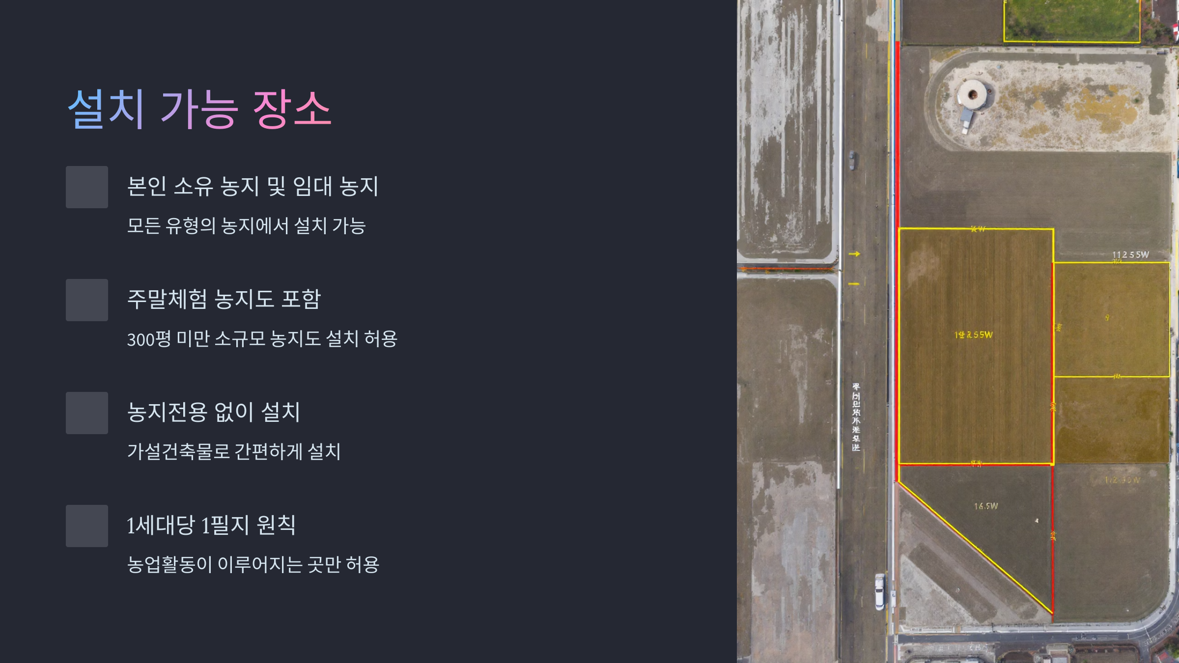 - 쉼터 + 부속시설 면적 × 2 이상의 농지 필요