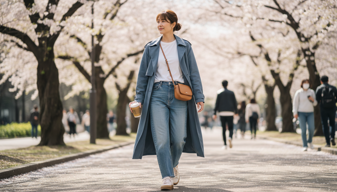 트렌치코트와 데님 팬츠, 스니커즈의 조합은 실패할 수 없는 캐주얼룩의 정석입니다. 밝은 컬러의 이너 티셔츠나 맨투맨을 매치하면 경쾌한 봄 분위기를 더할 수 있어요. 코트를 살짝 걸치거나 소매를 걷어 올리면 더욱 자연스러운 멋을 낼 수 있습니다.