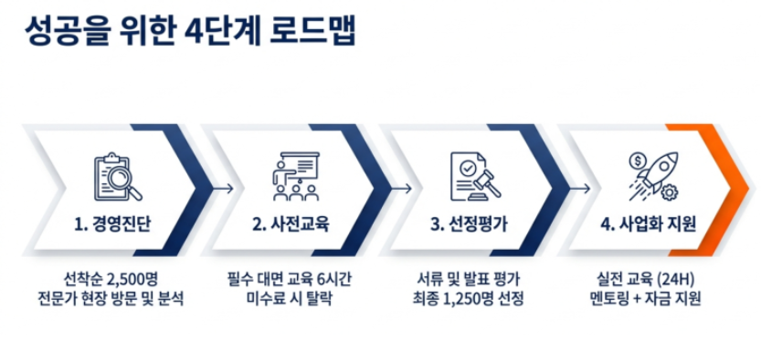 단순히 돈만 주는 사업이 아닙니다. 사장님이 다시 일어설 수 있도록 체계적인 커리큘럼이 준비되어 있어요.