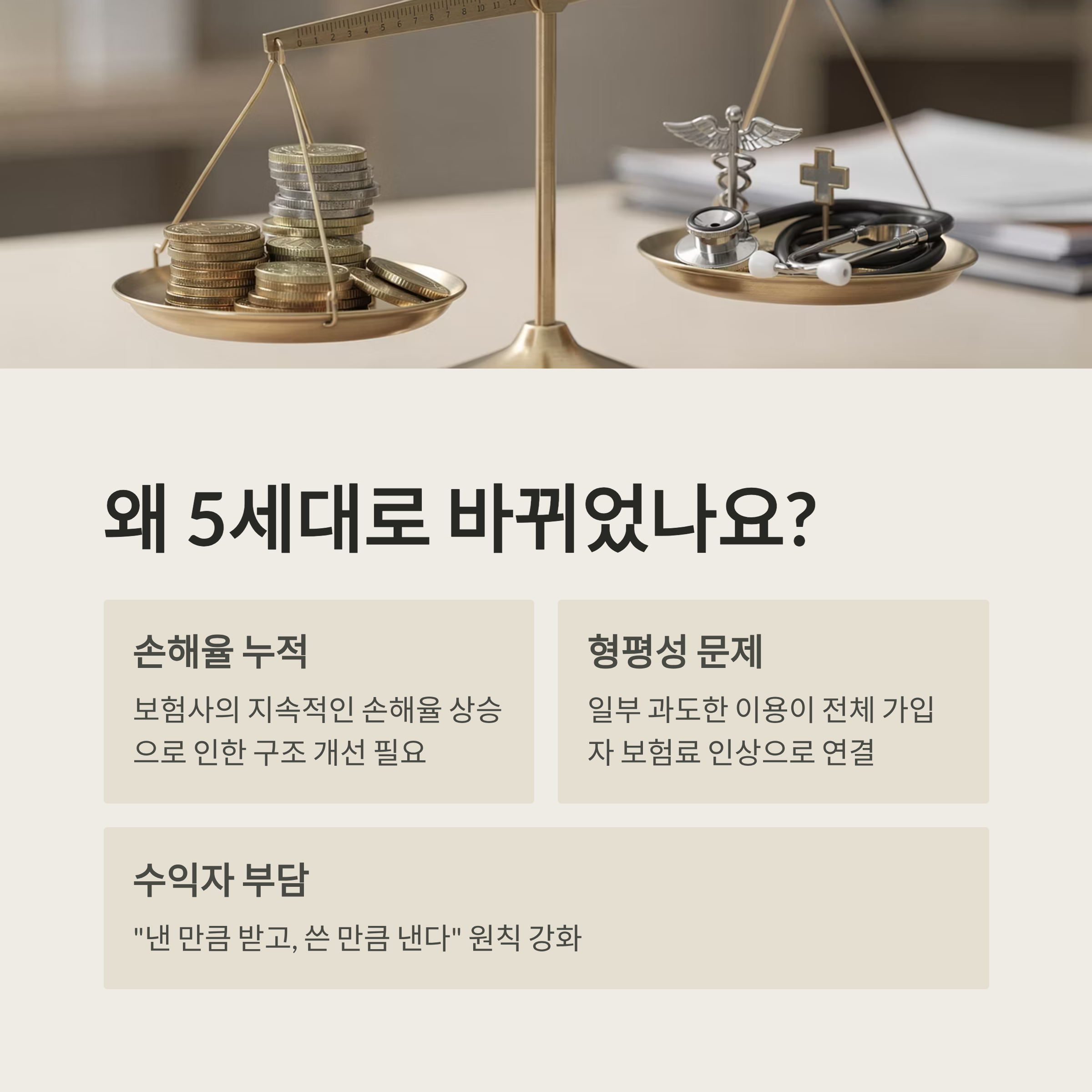 가장 큰 이유는 보험사의 손해율 누적과 보험료 부담의 형평성 때문이에요. 일부 이용자의 도수치료, 영양제 주사 등 과도한 비급여 이용이 전체 가입자의 보험료 인상으로 이어지는 구조를 개선하고자 '수익자 부담 원칙'을 극대화한 것이 5세대의 핵심입니다.